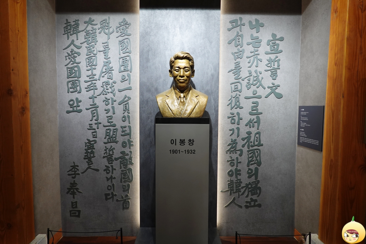 흉상 옆에 있는 글은 선서문으로, "나는 적성으로써 조국의 독립과 자유를 회복하기 위하야 한인애국단의 일원이 돼야 적국의 수괴를 도륙하기로 맹서하나이다. 대한민국 십삼 년 십이월 십삼일 선서인 한인애국단 앞 이봉창" 흉상 아래 발그림에 서 있으면 선서문을 음성으로 들을 수 있다.