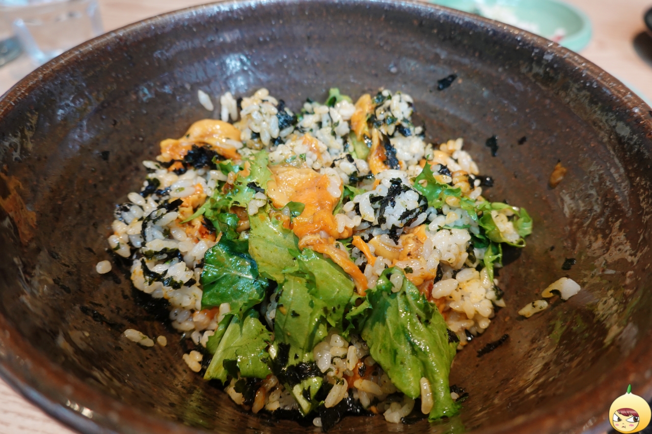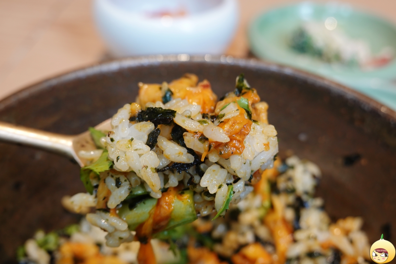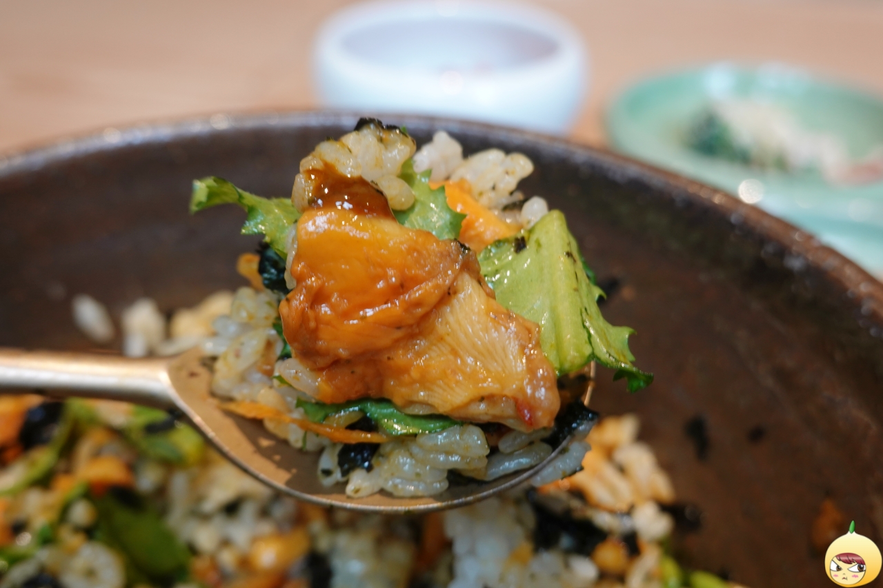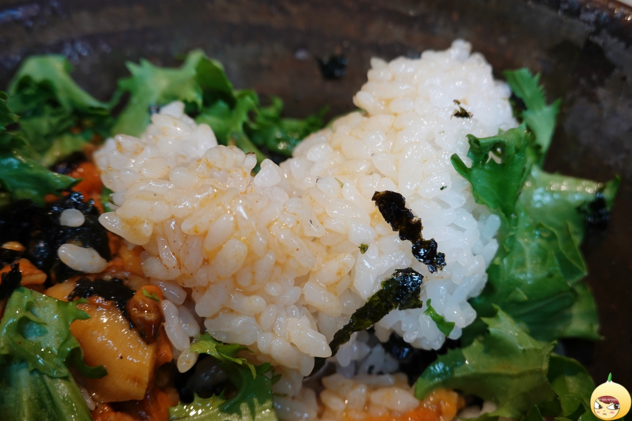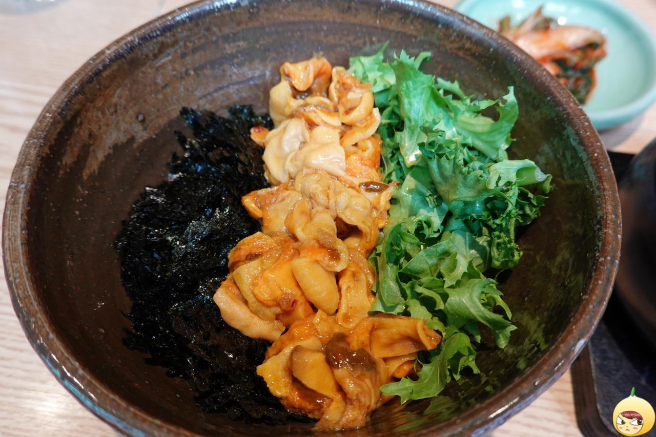멍게를 중심으로 양쪽에 김가루와 상추 계통의 채소가 가지런히 놓여있다. 그 아래에는 밥과 고소함을 담당하고 있는 참기름이 있다. 참, 멍게는 날 것 그대로이며, 양념 따위는 전혀 하지 않았다. 왜냐하면, 멍게는 그 자체만으로도 훌륭한 양념이 되기 때문이다.