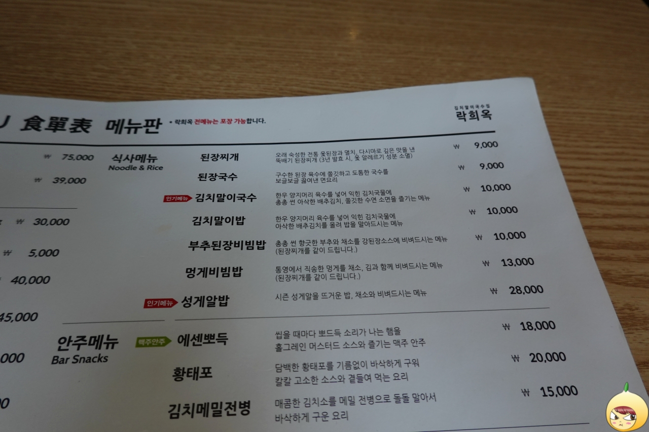 전체적으로 사악한 가격이지만, 식사메뉴는 나름 합리적이다. 메뉴가 많지 않으니 도장깨기를 할 만한데, 봄에는 멍게비빔밥을, 여름에는 김치말이국수를 주로 먹는다. 지금은 3월로 봄이 오고 있기에, 통영에서 직송한 멍게로 만든 멍게비빔밥(13,000원) 먹을 거다.