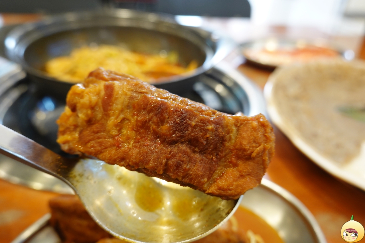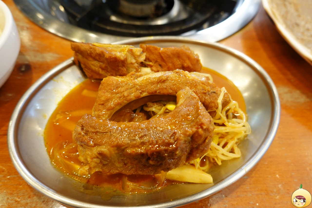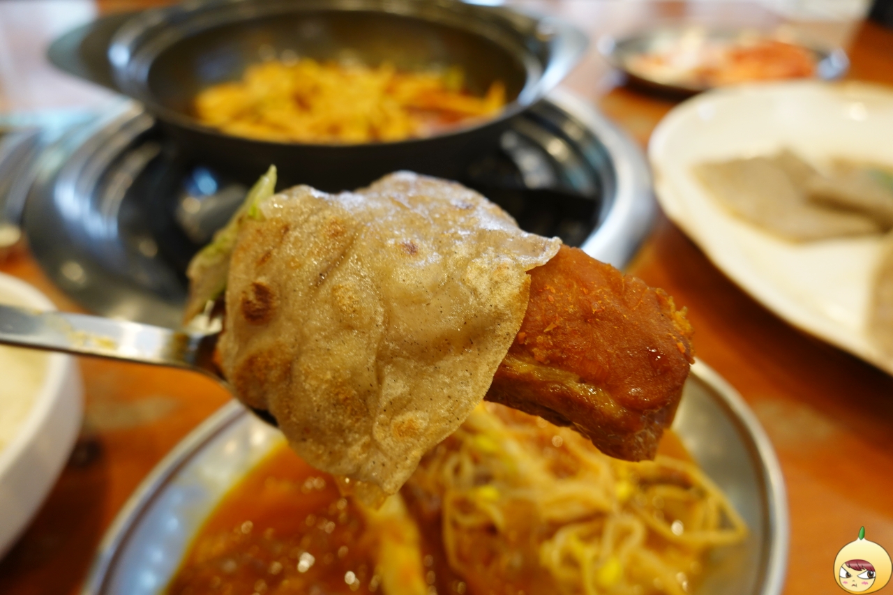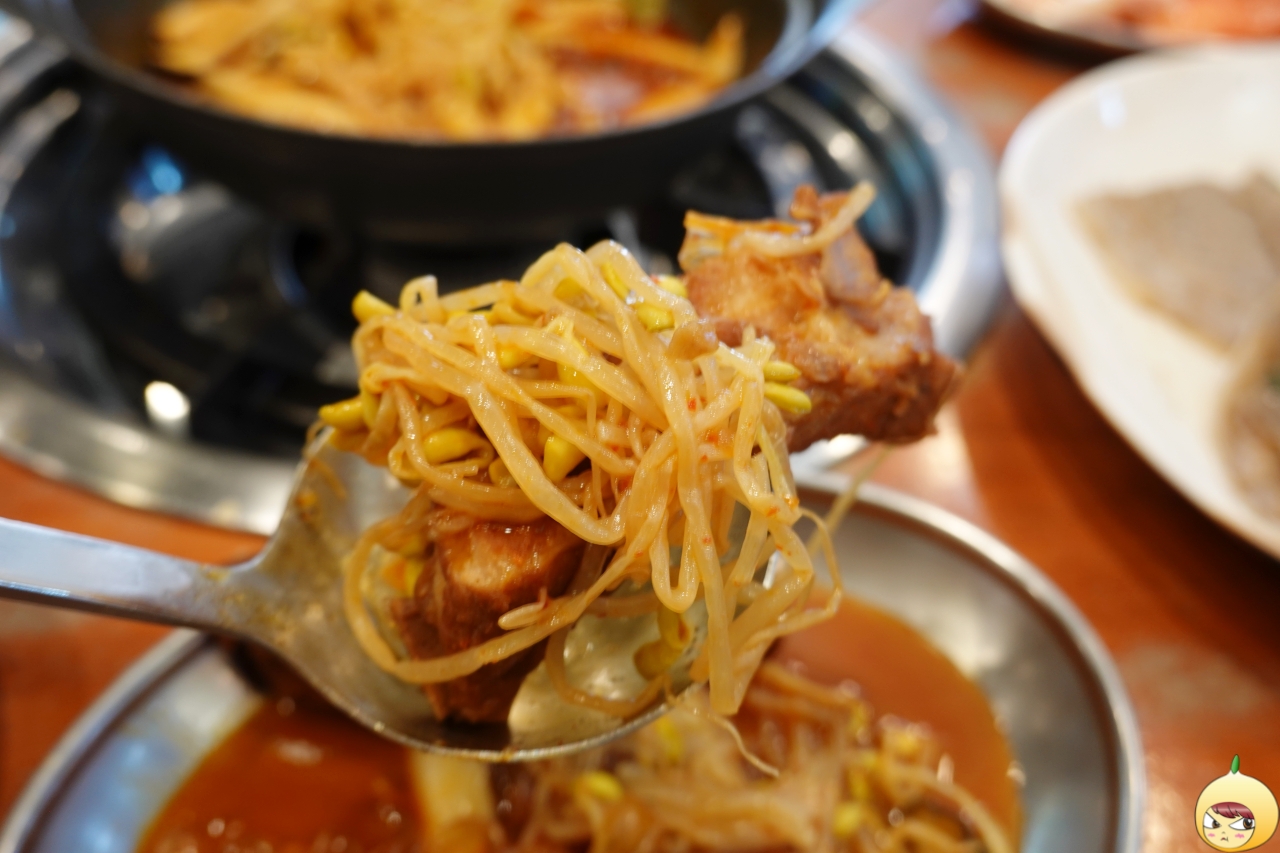 등갈비가 3개라서 소중하게 아껴 먹어야 한다. 처음은 본연(?)의 맛으로 먹는다. 잡내 따위는 1도 없고 고기가 어찌나 부드러운지 쏙 빠진다. 맛은 매콤함이 지배하고 있지만, 달큼함도 있다. 하지만 맵(순)둥이에게는 그저 맵기만 할 뿐이다. 그래서 나머지 2개는 콩나물에 메밀전을 더해서 먹어야만 했다.
