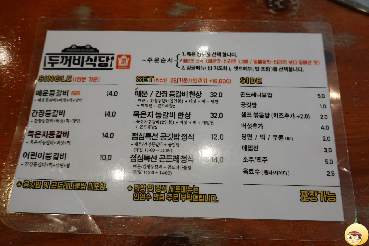 단품에 비해 점심특선은 가격도 저렴하고 공깃밥도 준다. 11시부터 14시까지 시간제한뿐일까? 주인장에게 물어보니, 단품은 등갈비가 4개, 세트는 3개가 들어간다고 한다. 등갈비가 꽤나 섭섭하게 들어있다.