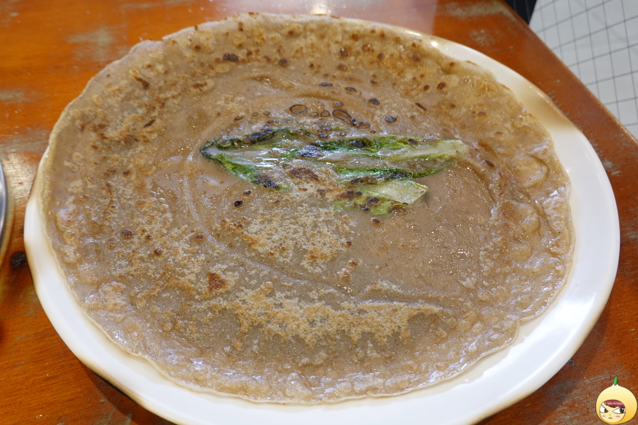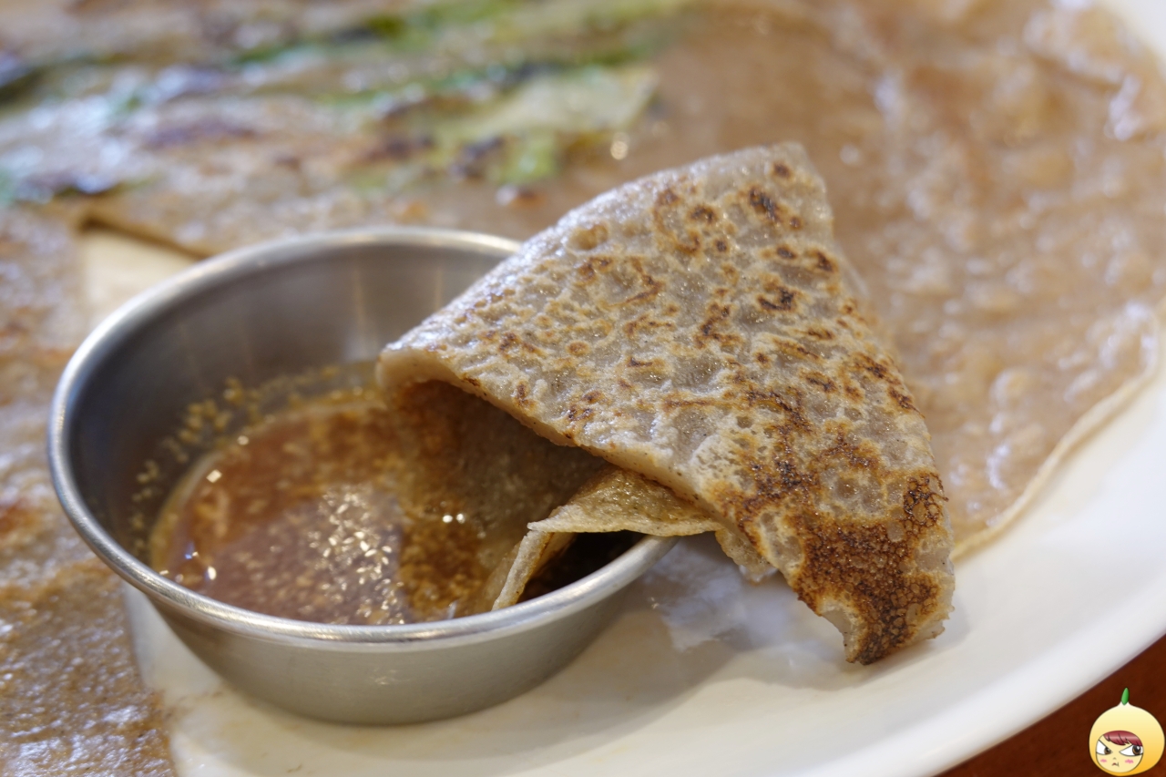 메인 음식을 2인 이상 주문 시 메밀전은 서비스로 나온다고 한다. 위대하지도 않고 혼밥이니 내돈내산을 해야 한다. 얼갈이배추 같은 채소는 고명인 듯싶고, 큰 쟁반을 가득 채울 정도로 넓이는 맘에 든다. 하지만 두께가 매우 얇다는 거, 안 비밀이다. 참, 가장자리는 바삭하지만 나머지 부분은 구수하니 쫀득하다.
