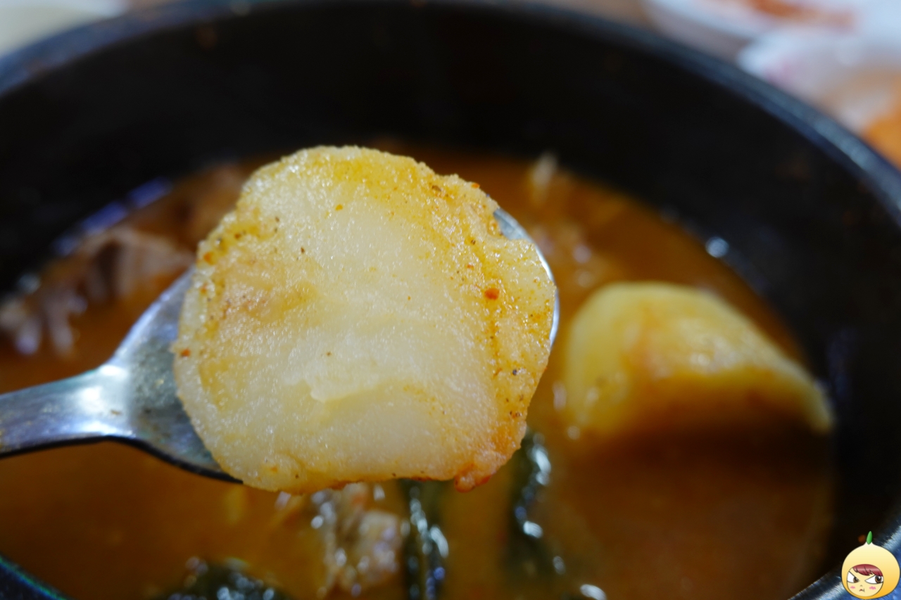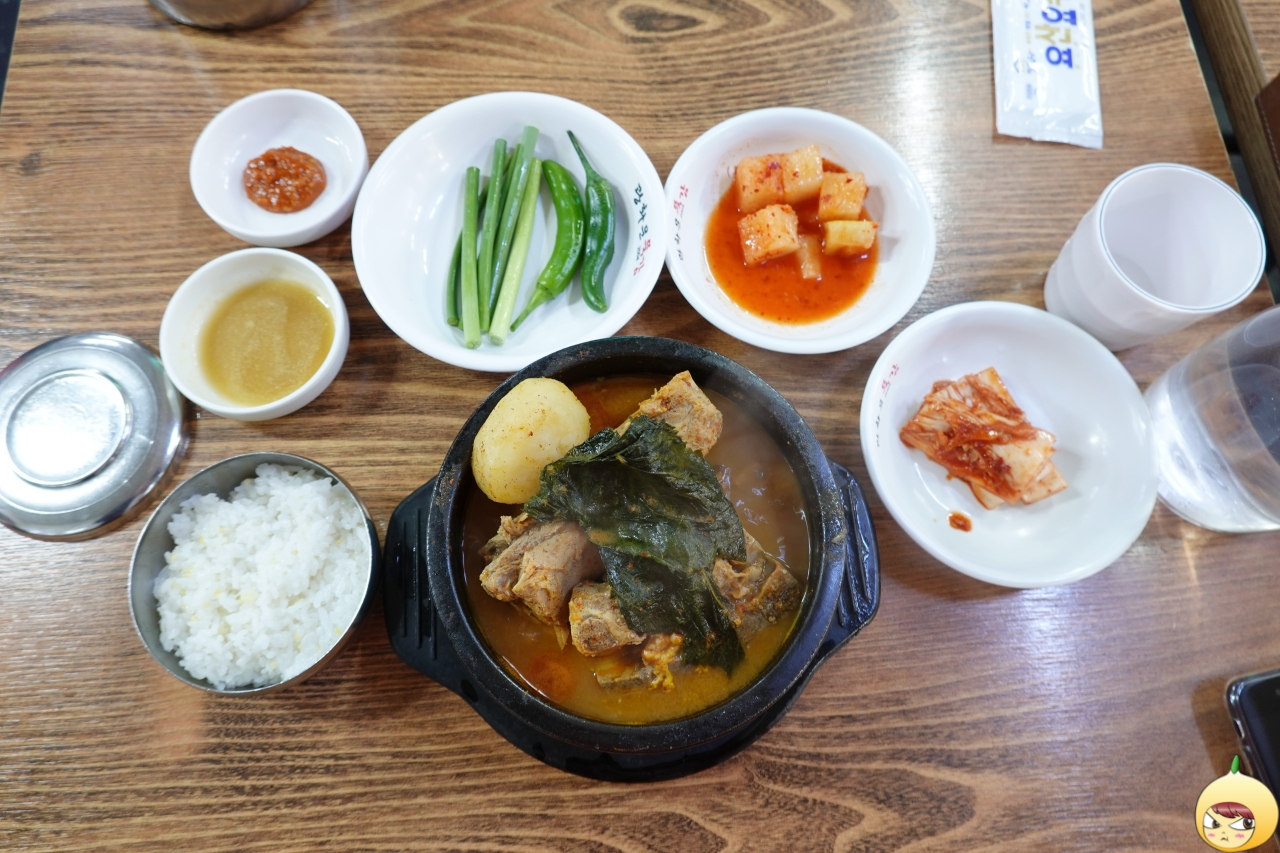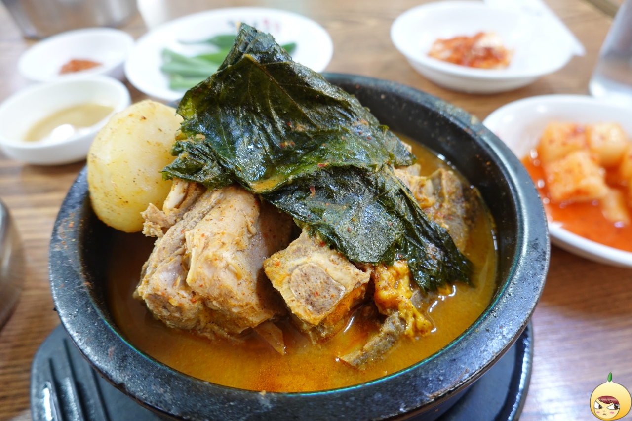 뚝감은 뚝배기감자탕의 줄임말이다. 미리 만들어져 있기에 주문과 동시에는 아니지만 거의 그 정도로 빠르게 나온다. 무심하게 올려져 있는 깻잎 아래 커다란 뼈가 있고, 그 옆에는 작은 통감자가 하나 있다. 감자탕이나 뼈해장국으로 블로그를 검색하면, 광화문뚝감을 포함해 2개가 나온다.