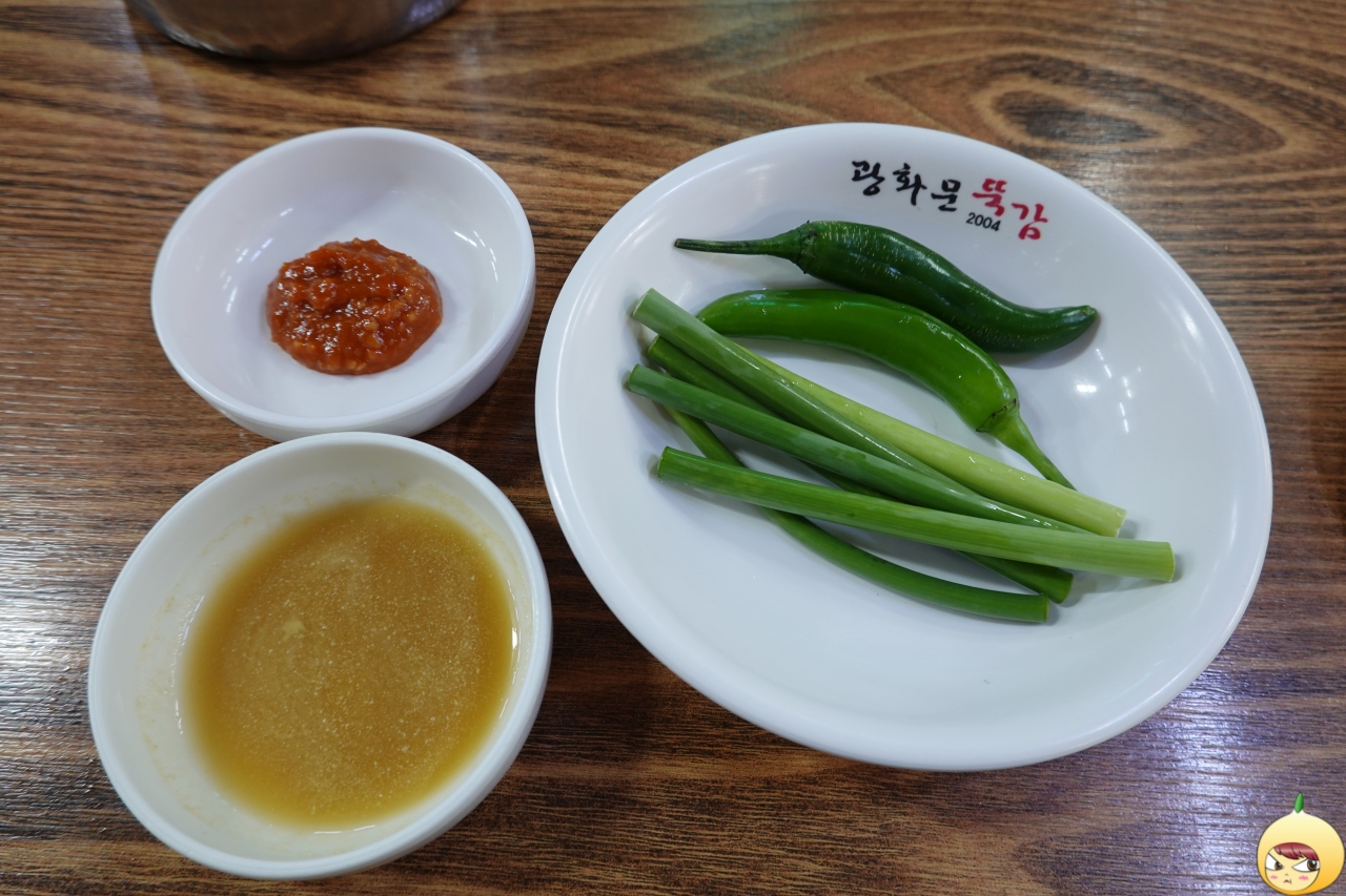 물에 빠진 고기를 먹을 때, 김치는 무조건이다. 적당히 잘 익은 깍두기와 살짝 덜 익은 배추김치는 취향대로 먹으면 된다. 개인적으로 깍두기를 더 좋아해서, 리필까지 해서 먹었다. 겨자소스와 고추(매울까 봐 먹지 않아서 청양인지 오이인지 모름)는 알겠는데, 마늘종은 낯설다.