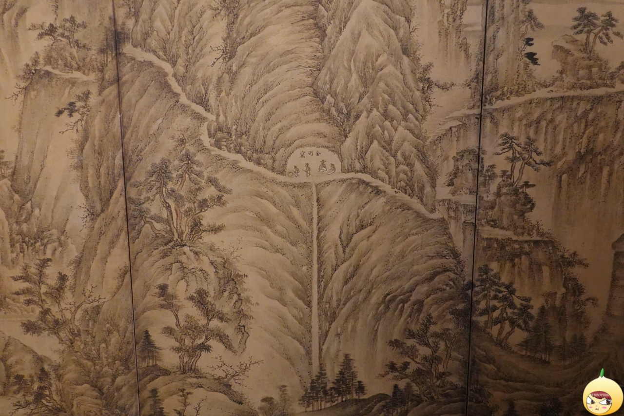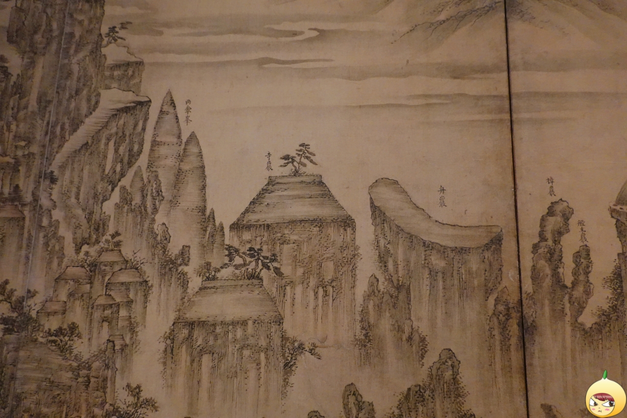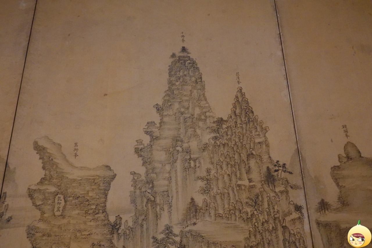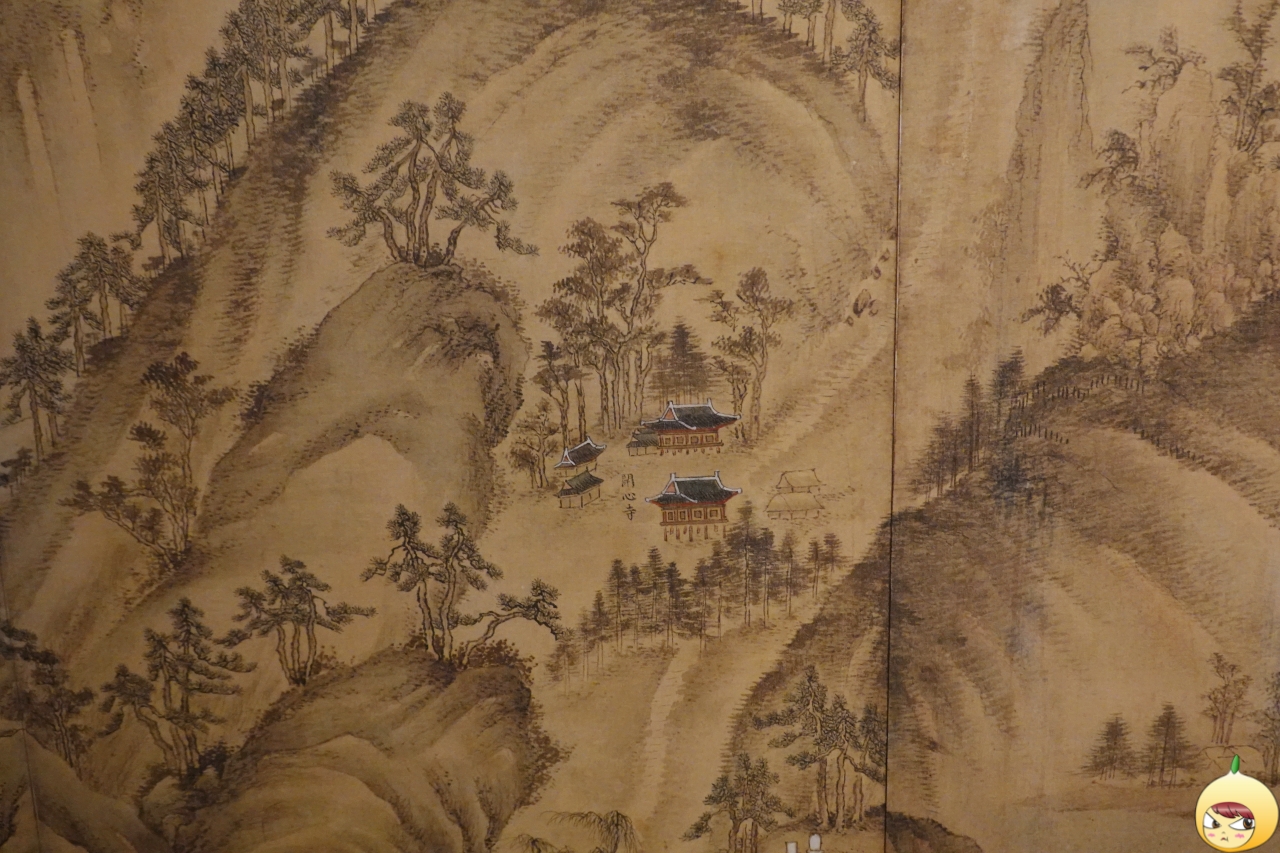 디지털 영상을 본 후, 다시 칠보산도병풍 앞에 섰다. 몰랐을 때는 그저 멀리서 바라봤는데, 좀 더 가까이 다가가 영상에서 본 곳들을 찾기 시작했다. 원본이라면 촬영을 못했을 텐데, 복제품이라서 다행이다.