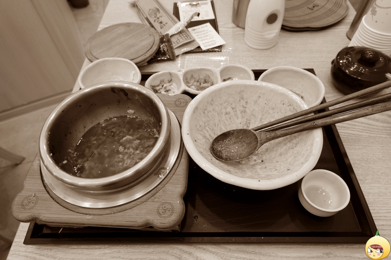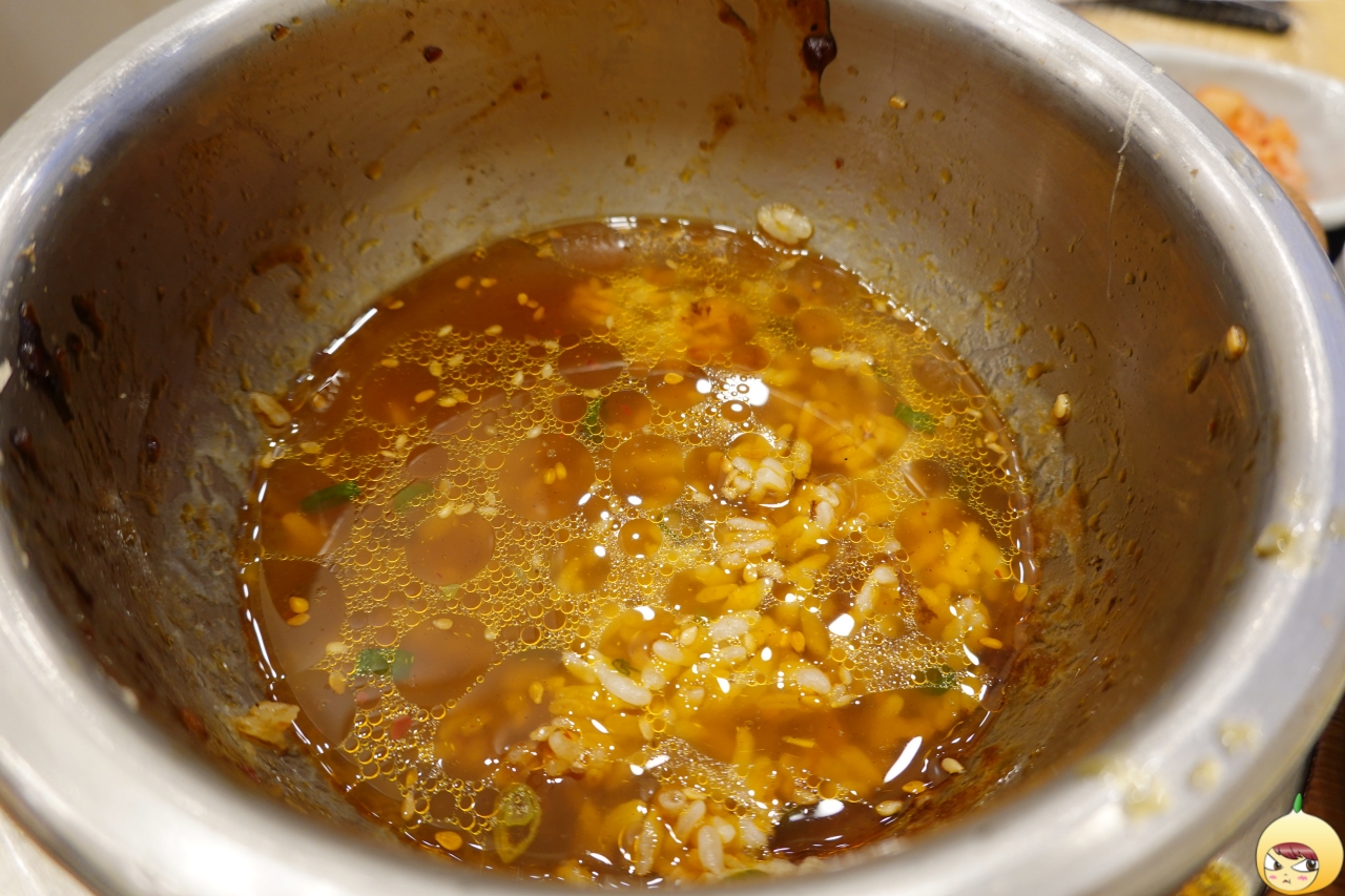 밥을 빈그릇에 옮긴 후, 뜨거운 물을 부어서 눌은밥을 만들어야 한다. 그런데 양념 더하기 기름이 많아 보인다. 자고로 눌은밥은 담백하니 고소한 맛으로 먹어야 하는데, 그냥 누룽지로 먹을까? 내적 갈등이 있었다는 거, 안 비밀이다.