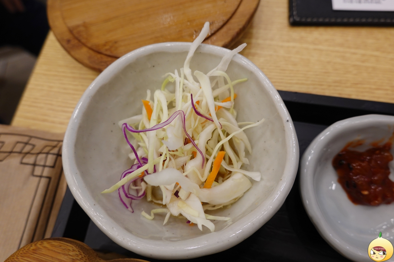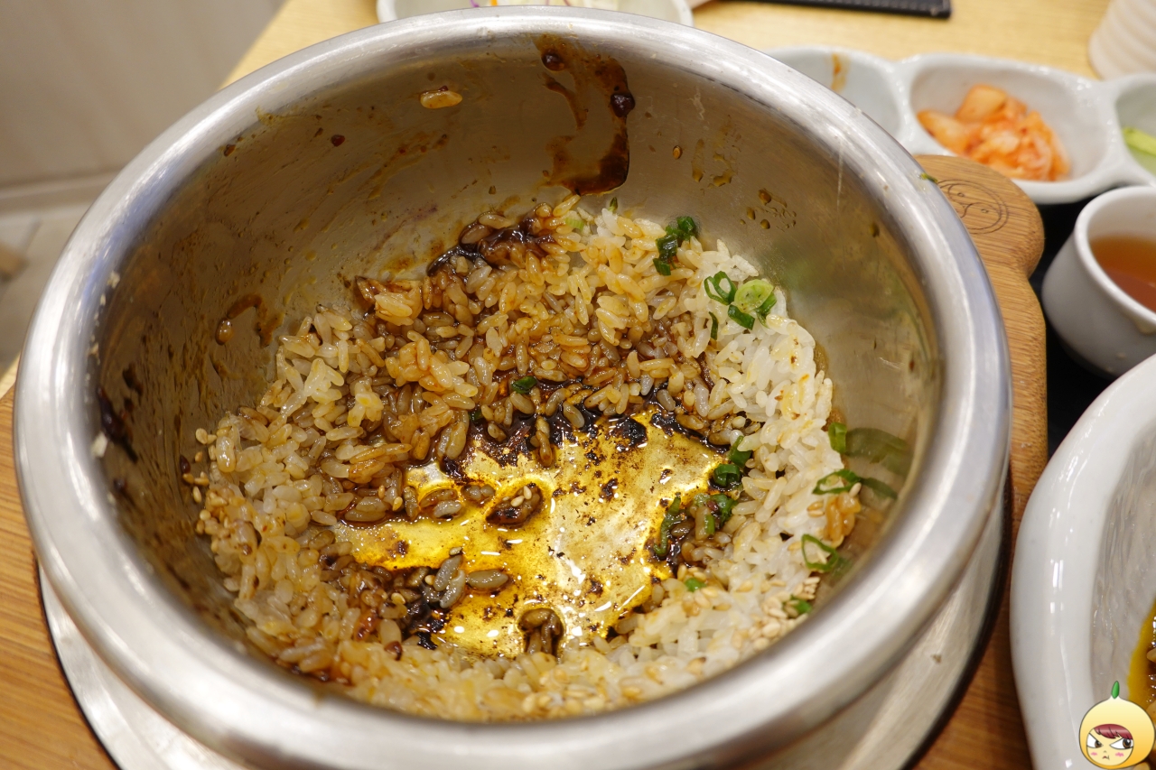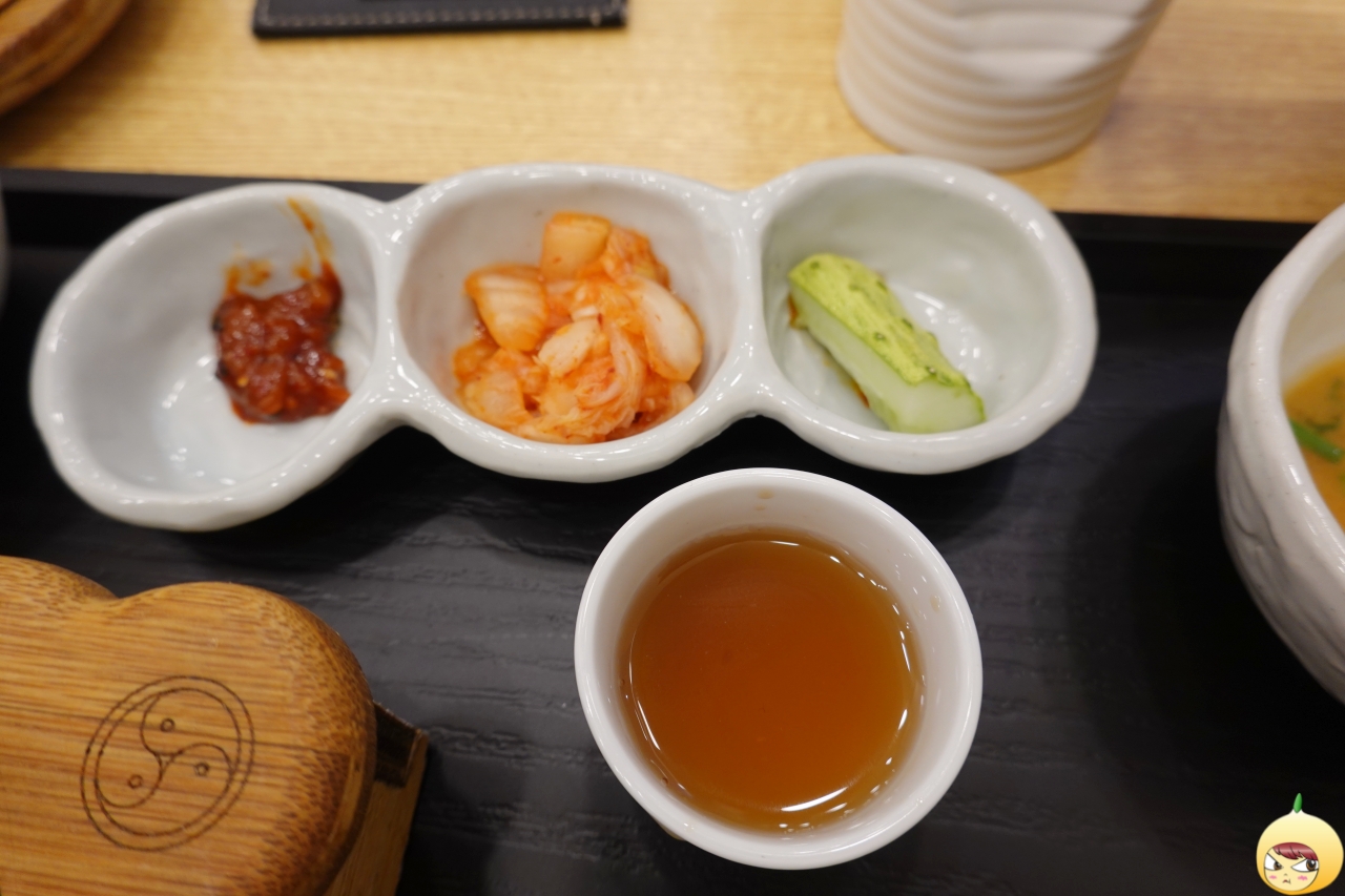 요런 솥밥은 대체로 밥과 반찬이 하나로 되어 있어, 굳이 반찬을 더할 필요가 없다. 그래서 소꿉놀이 하듯, 반찬을 소량만 준 듯하다. 반찬은 왼쪽부터 잘게 다진 오징어젓갈과 배추김치 그리고 쌈장&생오이 한 조각이다. 옆에 있는 종지는 간장이 아니라 식후에 먹는 수정과다.