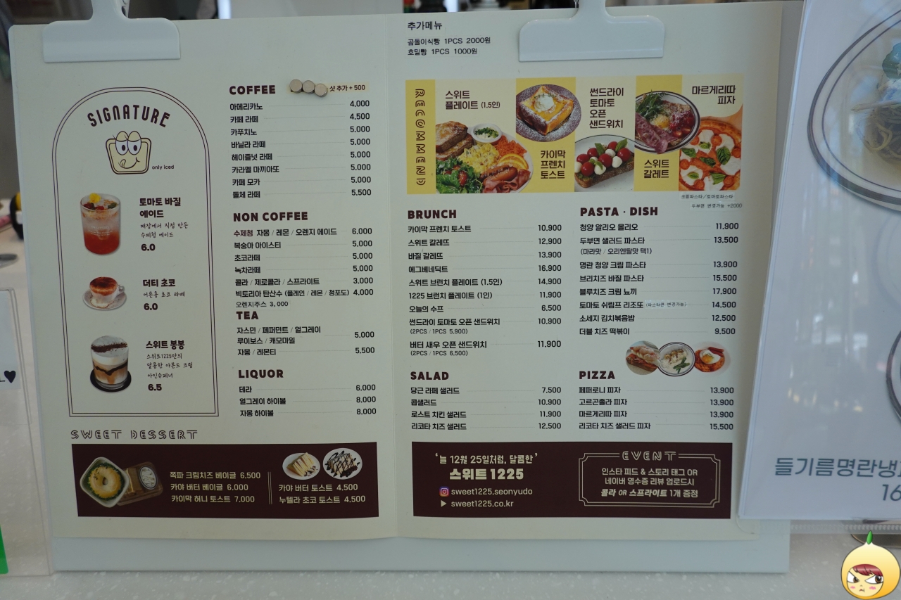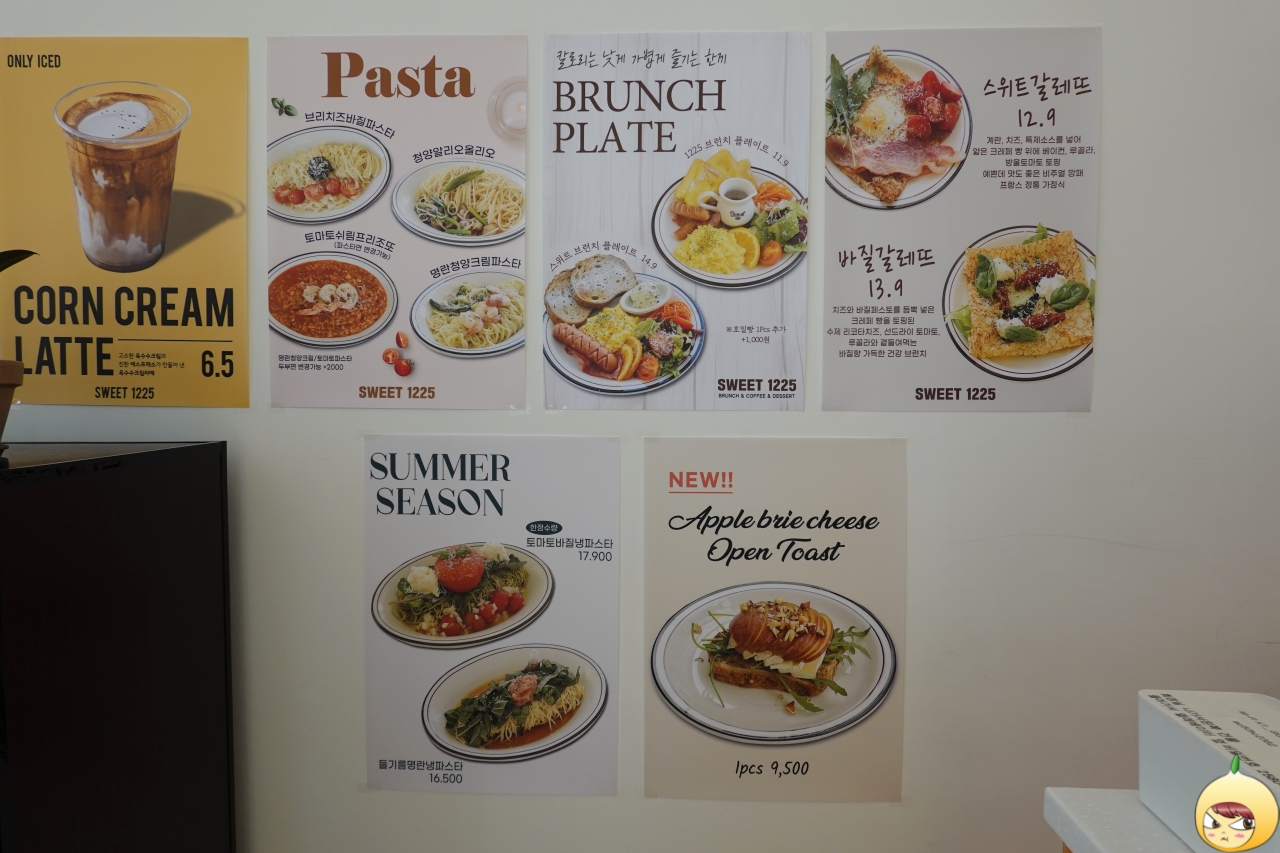 밖에서 봤을 때는 공간이 넓은 줄 알았다. 그런데 안으로 들어오니 높은 층고와 달리 테이블이 있는 공간은 넓다는 느낌보다는 여유롭다. 왜 스위트1225인가 했더니, 늘 12월 15일처럼 달콤한~이라고 나와있다. 싱글에게 1225는 그리 달콤하지 않다는 거, 쉿~ 비밀이다.