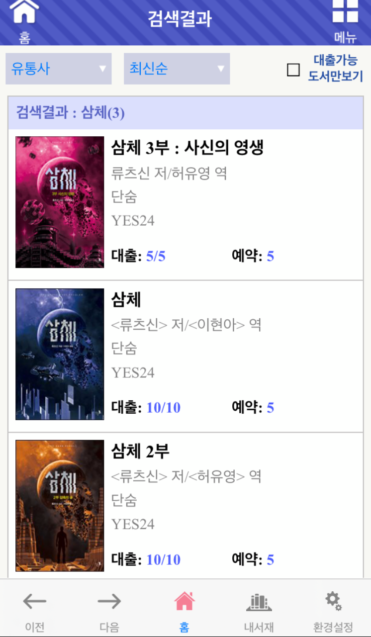 어느날 새벽 3시, 눈이 떠졌고 화장실을 다녀온 후 다시 자려다 혹시나 하는 맘에 앱을 확인했다. 아싸~ 삼체 1권 대출:10/9라고 나와 있다. 예약자에게 먼저 기회를 줄 거라 생각하면서, 아니다. 예약을 하지 않았는데, 먼저 봤다다면 대출이 가능하다. 그렇게 1권을 읽고, 또다시 새벽에 2권을 대출, 3권도 같은 방식으로 대출해서 다 읽었다. 책 읽는 시간보다 대출을 기다리는 시간이 더 오래 걸렸다는 거, 안 비밀이다.