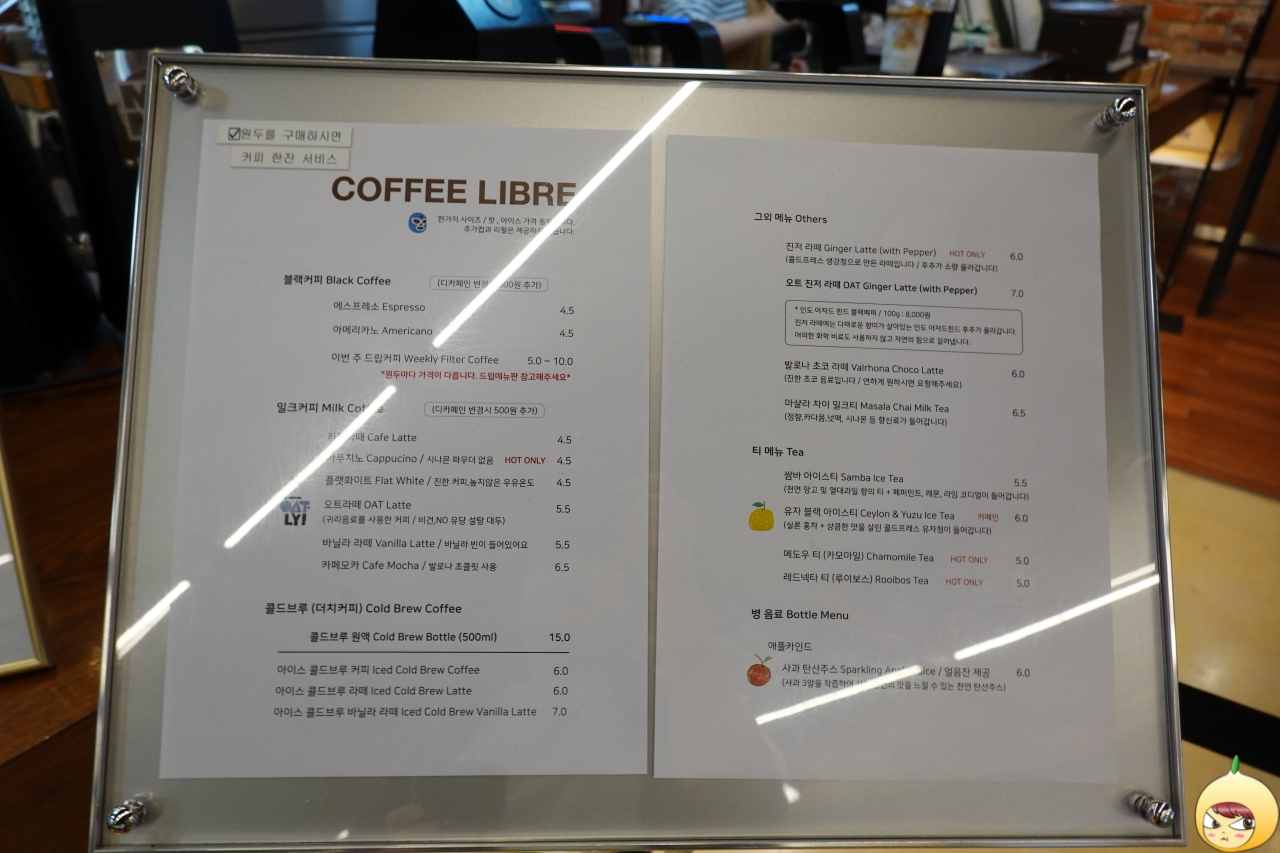 자칭 커피애호가이지만, 아직은 원두를 구입할 단계가 아니기에, 우선은 원두를 신경 써서 사용하는 카페에 간다. 산미 원두를 드립커피로 마시면 더 나을까? 궁금하지만 산미에 대한 불호부터 없애야 하므로, 부담 없이 마실 수 있는 아이스 아메리카노(4,500원)를 주문했다. 참, 커피리브레는 텀블러를 가져가면 할인(500원)을 해준다.