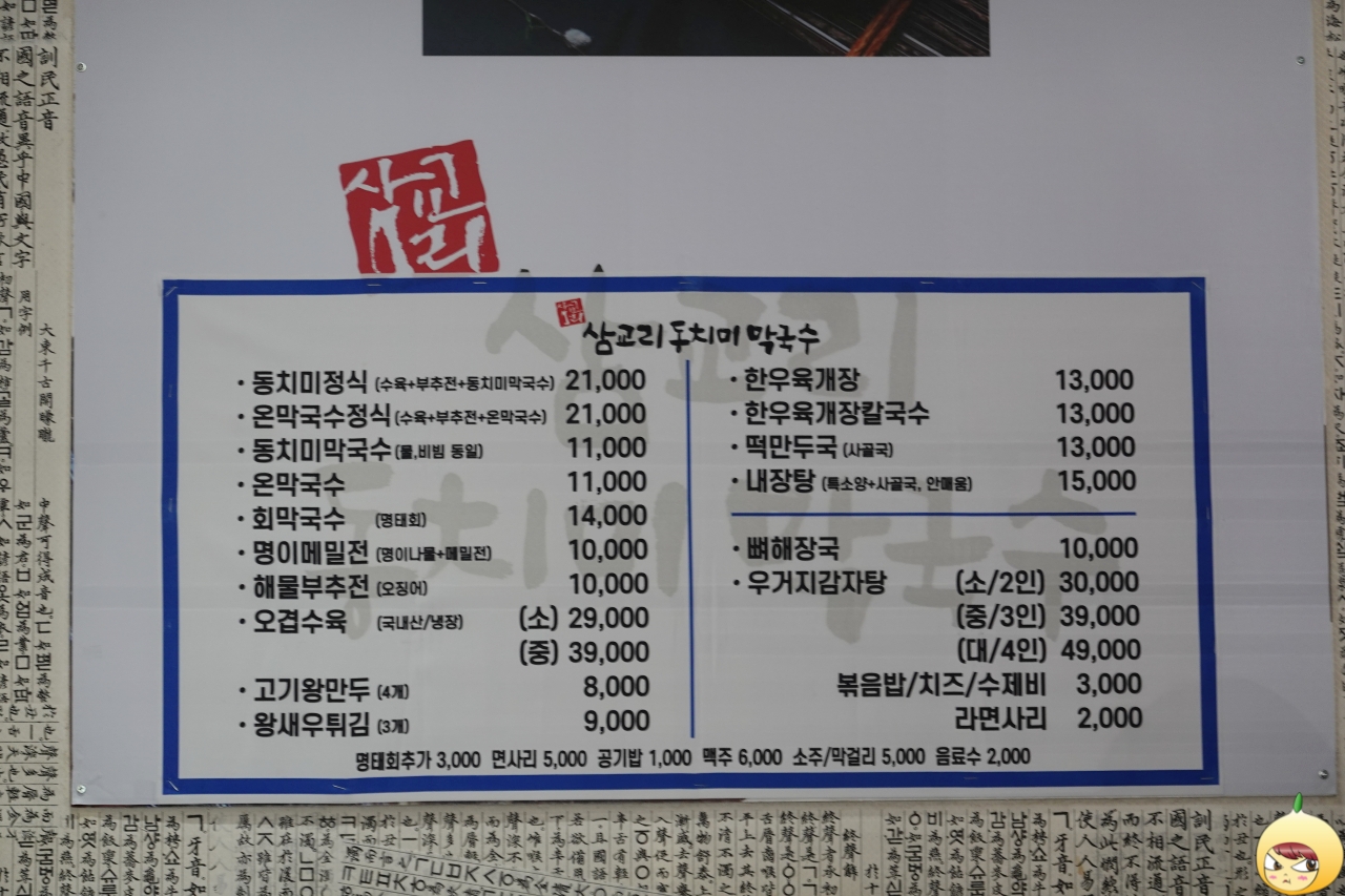 체인점이지만 삼교리동치미막국수가 끌렸던 이유는 동치미막국수(11,000원)를 주문하면 물과 비빔을 다 먹을 수 있어서다. 주문하기 전에 물이냐? 비빔이냐? 고민하고 있는데, 직원이 오더니 고민하지 말고 둘 다 먹으란다.