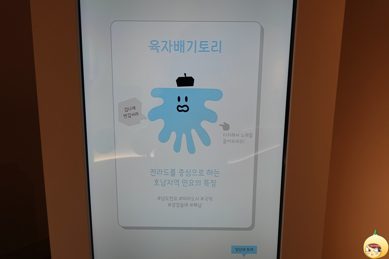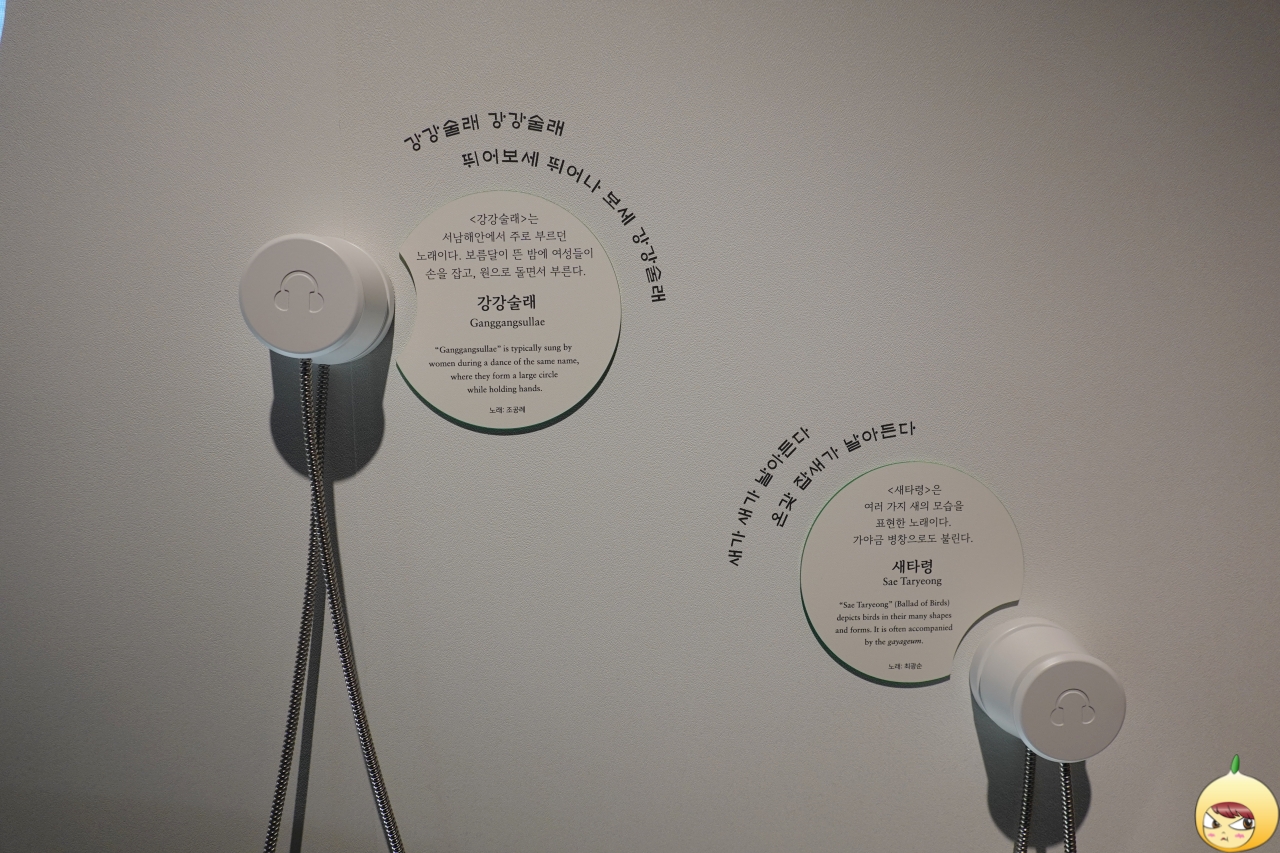 오른쪽 끝에 있는 스피커는 칭칭이 소리로 "치기나 칭칭 나네 얼씨구나 좋을시고 치기나 칭칭 나네" 메나리토리는 미, 솔, 라, 도, 레의 음구조를 지닌다.