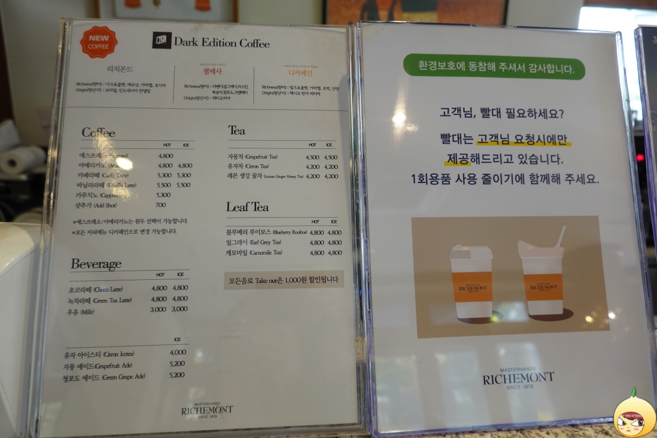 리치몬드과자점에는 산미가 있는 원두가 있다. 리치몬드는 다크 원두, 첼베사가 산미원두로 라벤더, 얼그레이, 자스민, 복숭아, 청포도, 크랜베리 향미가 있다고 하는데, 하나도 느끼지 못했다는 거, 절대 안 비밀이다. 원두 원산지는 에티오피아이다. 요청 시에만 빨대를 제공한다는 문구, 무지무지 맘에 든다.