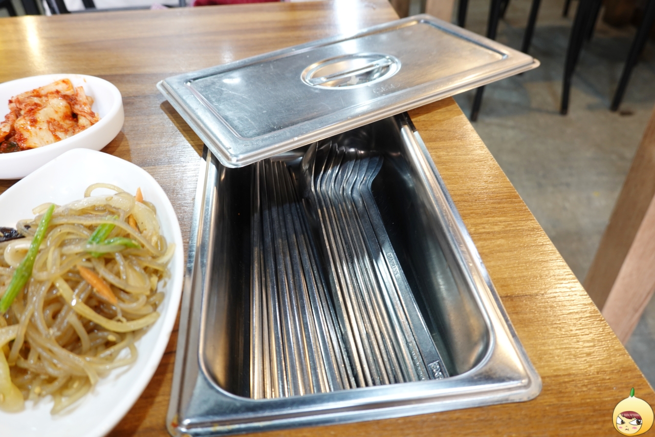 반찬을 보면 주인장의 손맛을 알 수 있다. 반찬만으로도 공깃밥을 순삭할 수 있을 정도로 맛깔나니 좋다. 잡채(=당면볶음)는 리필을 아니할 수 없지만 예전보다 소화력이 떨어져서 한 번으로 끝냈다. 참, 수저는 요기에 숨어 있다.
