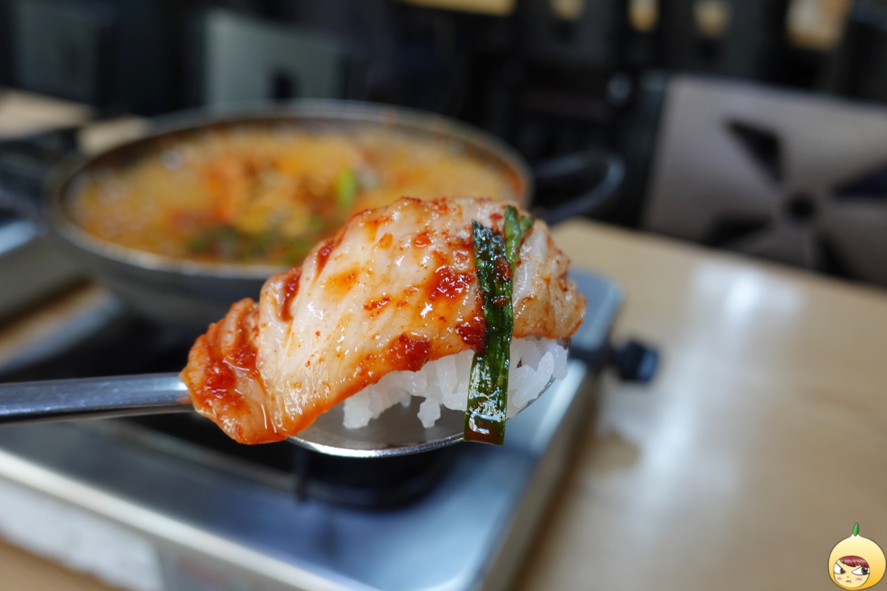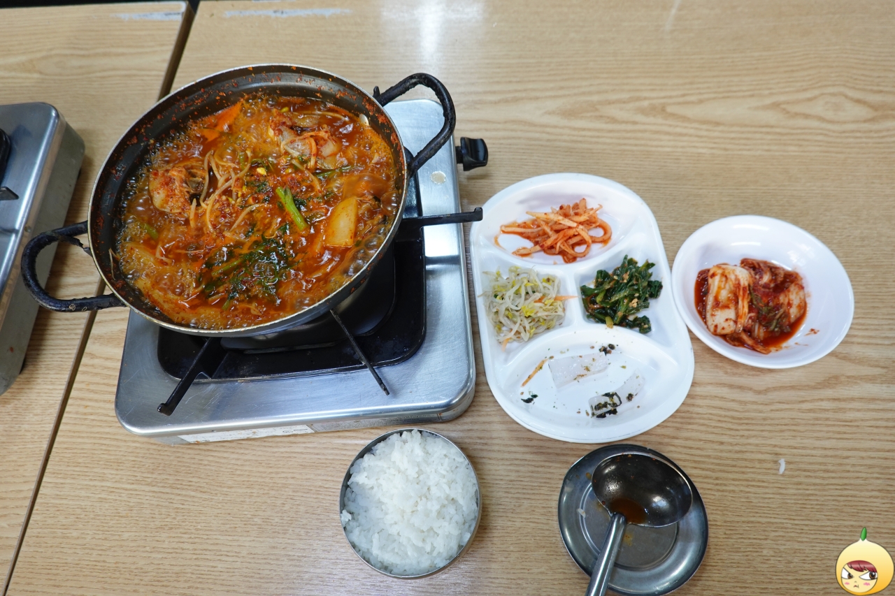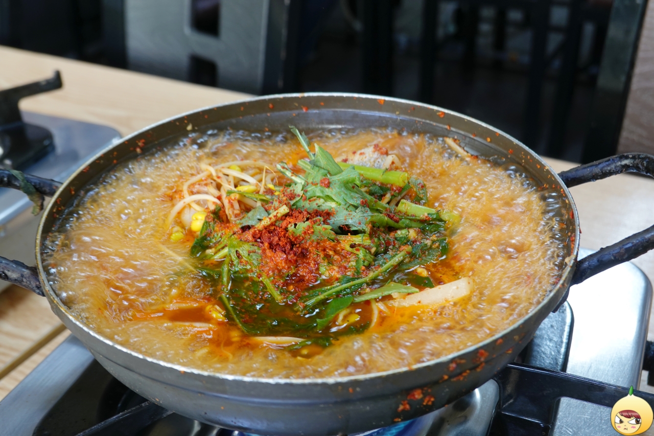 반찬은 아삭한 무생채와 숙주나물, 김맛 가득한 청포묵무침이 나왔다. 숙주나물 위에 있는 초록반찬은 무슨 나물 같은데 후각을 잃어버려서 모르겠다. 마지막 반찬은 배추 겉절이다.