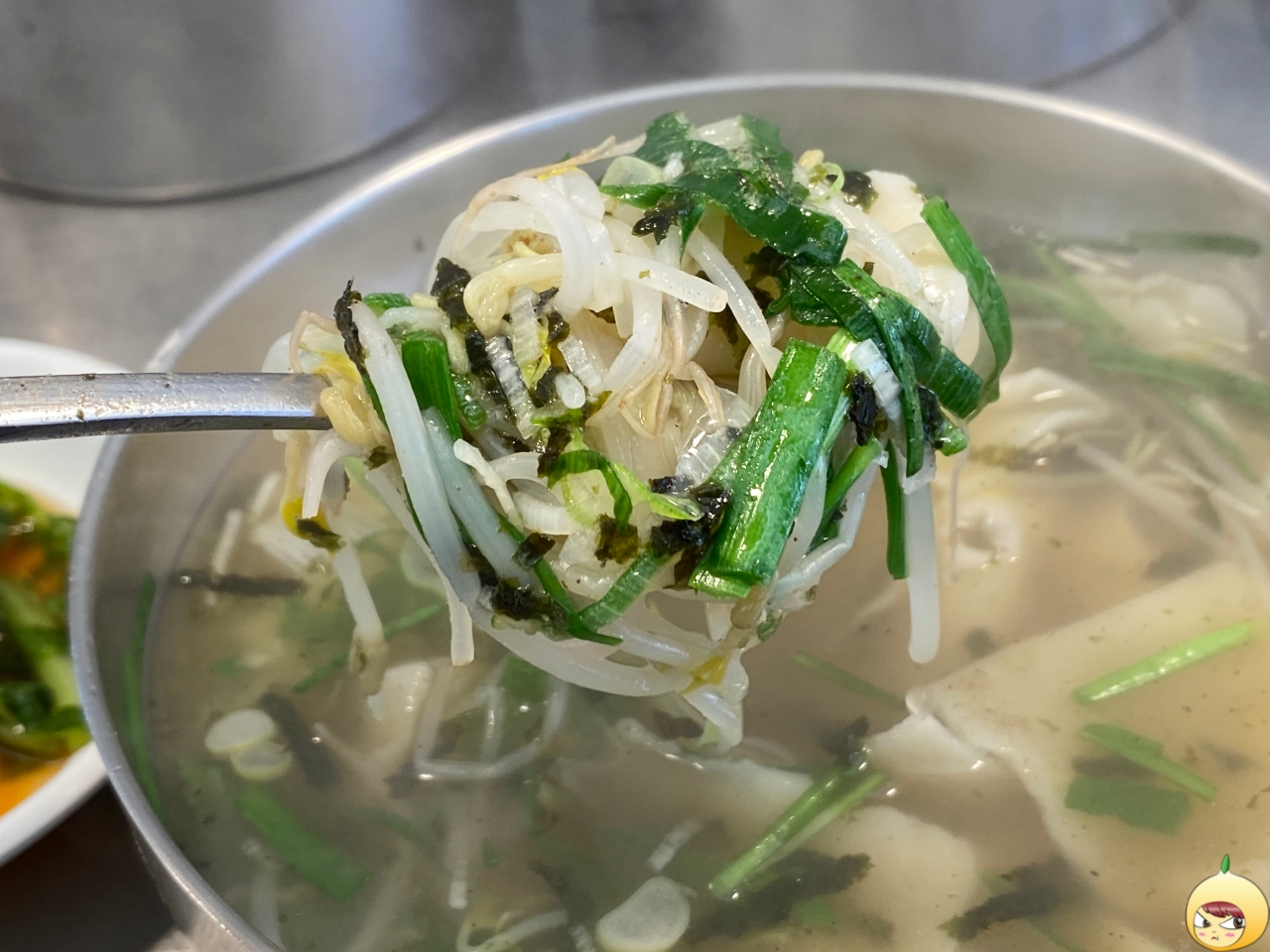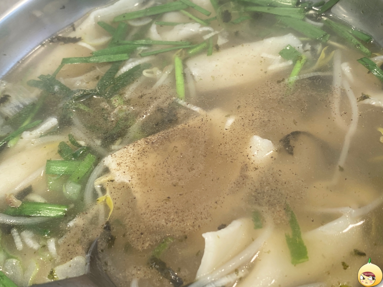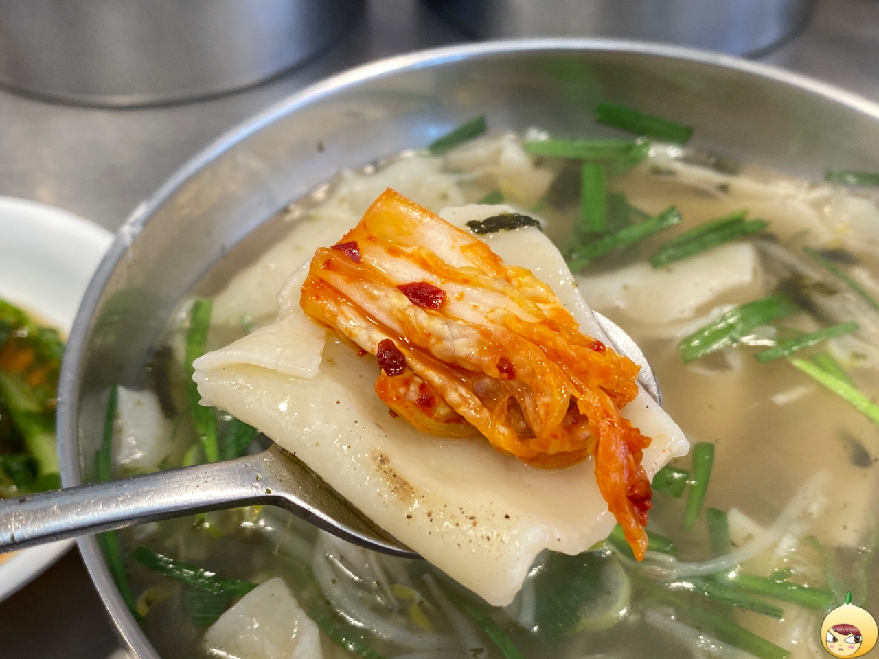 국물은 예상 그대로 적당히 진한 멸치육수다. 그나저나 칼국수에는 애호박인데, 광장수라간은 숙주나물과 부추가 들어있다. 그래서 수제비이지만, 쌀국수 같은 느낌도 났다.