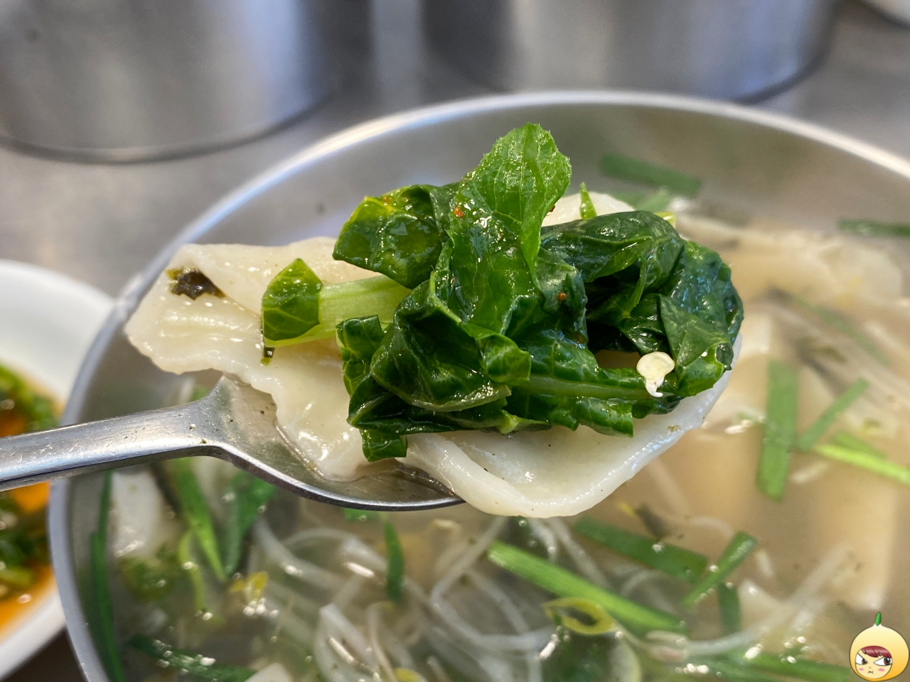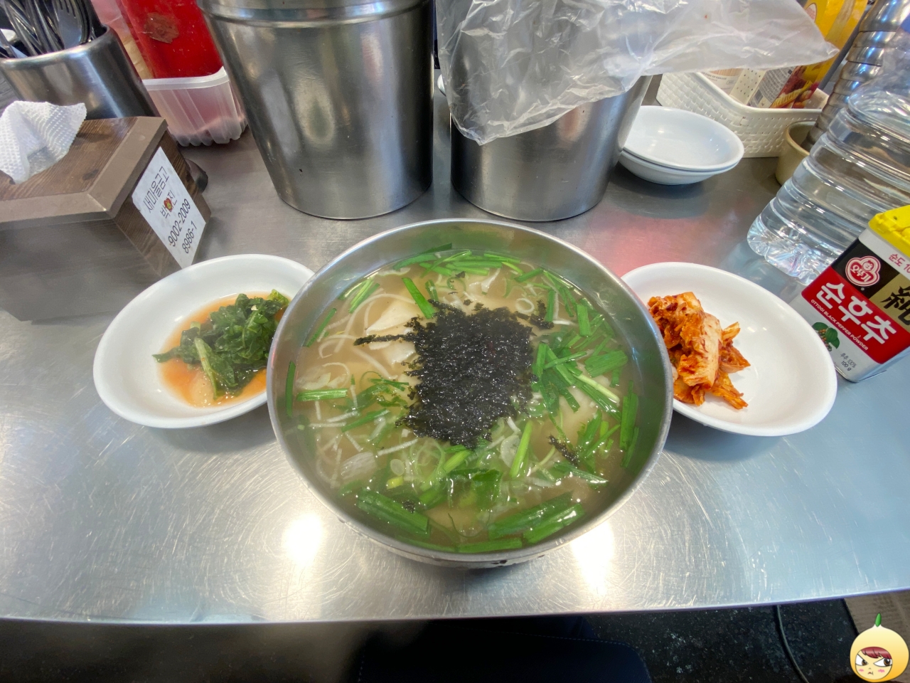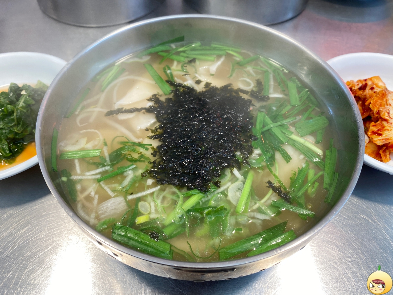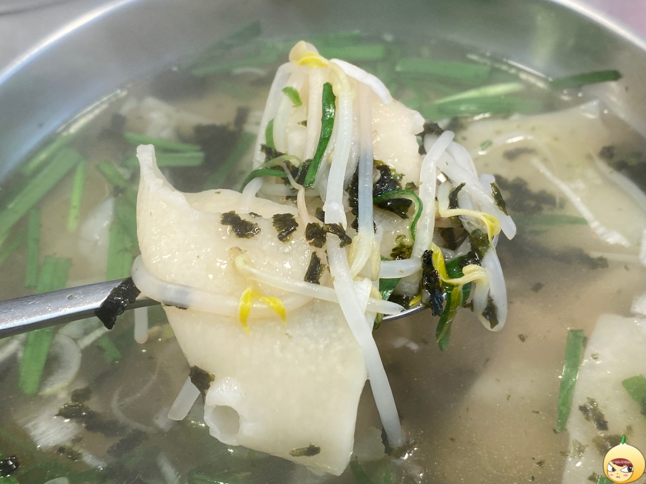 국물은 예상 그대로 적당히 진한 멸치육수다. 그나저나 칼국수에는 애호박인데, 광장수라간은 숙주나물과 부추가 들어있다. 그래서 수제비이지만, 쌀국수 같은 느낌도 났다.
