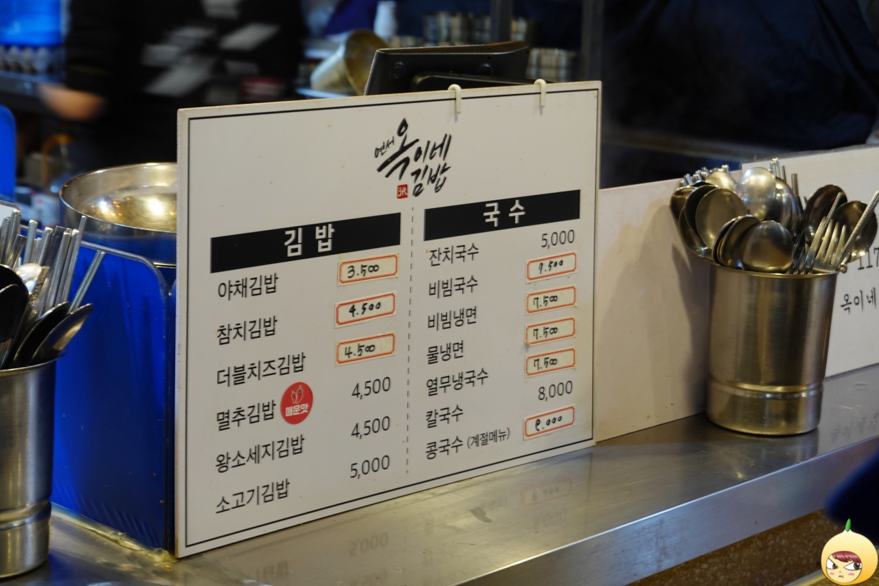 가장 먼저 찾은 곳은 옥이네김밥이다. 야채김밥에 비빔국수 그리고 직접 만든 김치를 꼭 먹어봐야 한다는데, 가는 날이 장날이라고 웨이팅이 엄청나다. 알고 보니, 설날을 앞두고 장관이 방문했단다. 기다려서 먹을까 하다가, 공복이기도 하고 기다림을 무지 싫어해서 야채김밥(3,500원)만 포장했다. 참고로, 포장을 하면 김치는 주지 않는다.