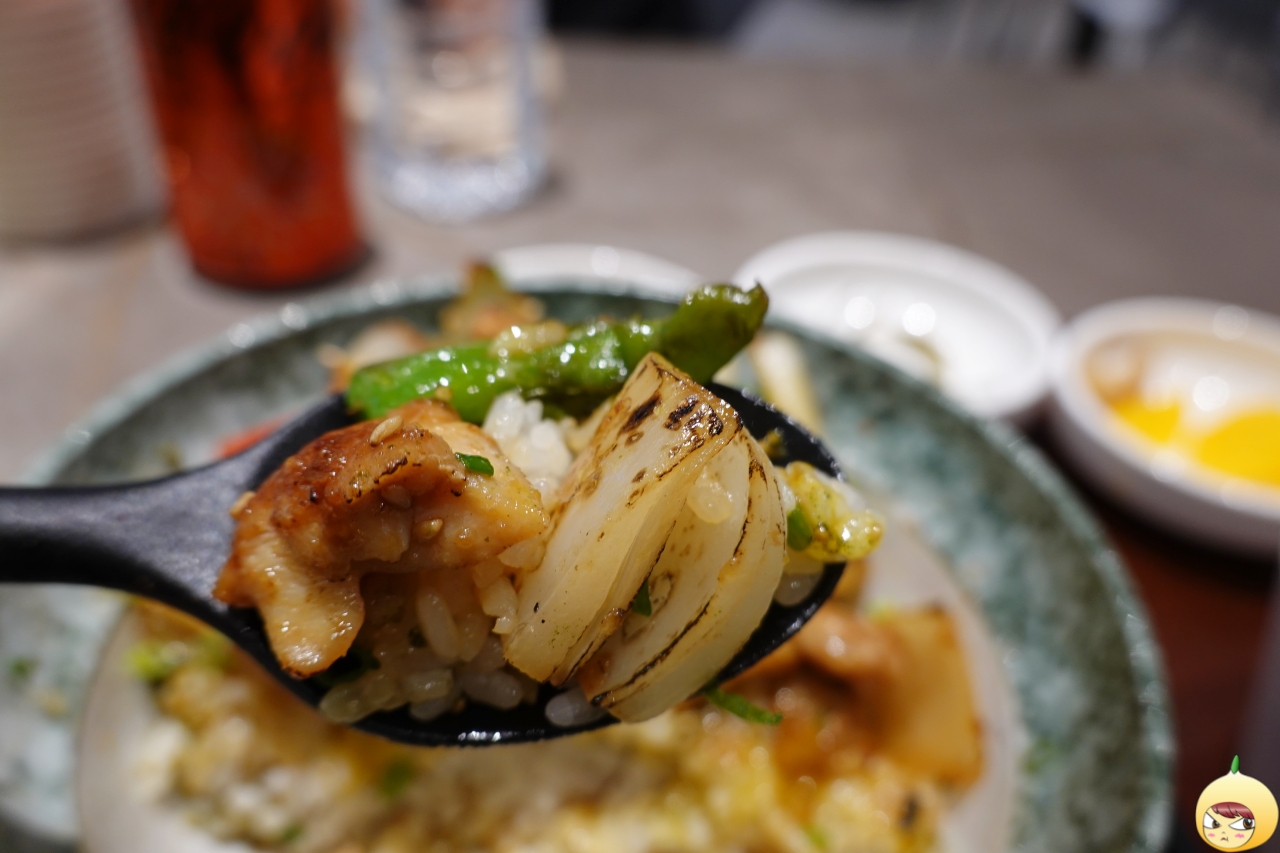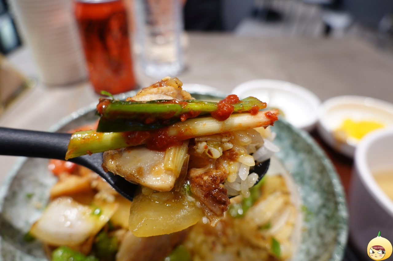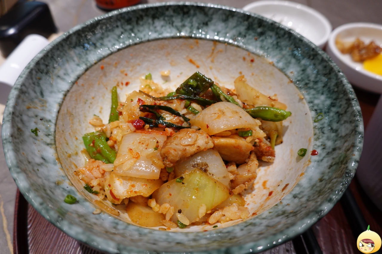 닭다리살과 양파, 파프리카, 꽈리고추는 철판에서 먹음직스럽게 잘 구워져 나왔다. 구운 채소가 주는 단맛에 부드러운 닭다리살의 조화는 냄새만으로도 충분히 알 수 있다. 여기에 입맛을 당기게 하는 불향까지 맘에 든다. 내용물을 살짝 걷어내면, 따로 양념이 되어 있는 밥이 들어있다.