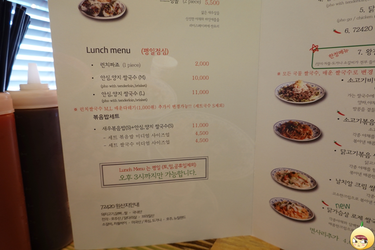 메뉴는 다양하지만, 다 볼 필요는 없다. 왼쪽 상단에 있는 평일점심 코너만 보면 된다. 3개의 단품 메뉴를 지나, 볶음밥세트에서 눈길을 딱 멈춘다. 새우볶음밥과 안심양지쌀국수를 세트(11,000원) 먹을 수 있단다. 단품으로 주문하면 양이 겁나 많던데, 양보다는 다양함을 추구하고자 볶음밥 세트를 주문했다.