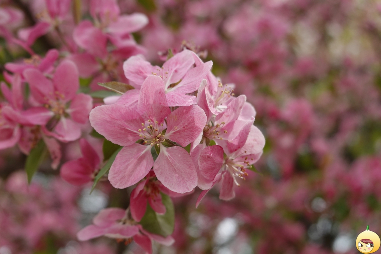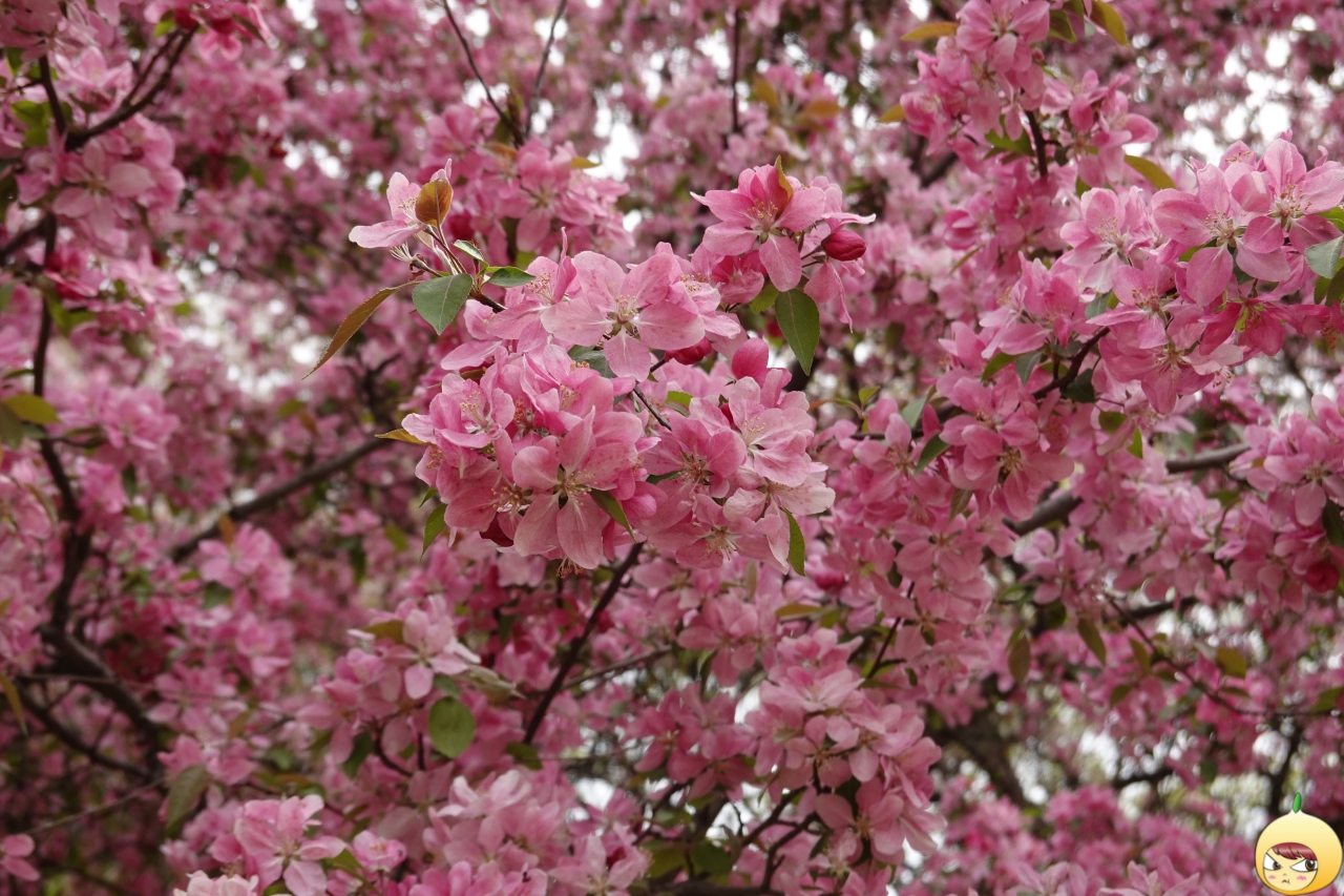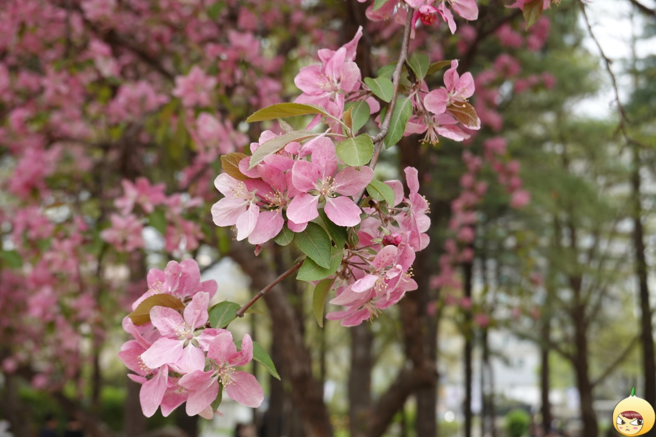꽃사과는 4월에 흰색 또는 연홍색 꽃이 피며, 9월에 열매가 붉게 익는다. 사과나무보다 딱딱하고 가시가 더 많다고 한다. 장미과에 속해서 그런지, 꽃이 꽤나 화려하다. 꽃사과도 벚꽃만큼 성격이 급한가 보다. 3일 후에 다시 갔을 때는 겹벚꽃은 만발, 꽃사과는 엔딩.