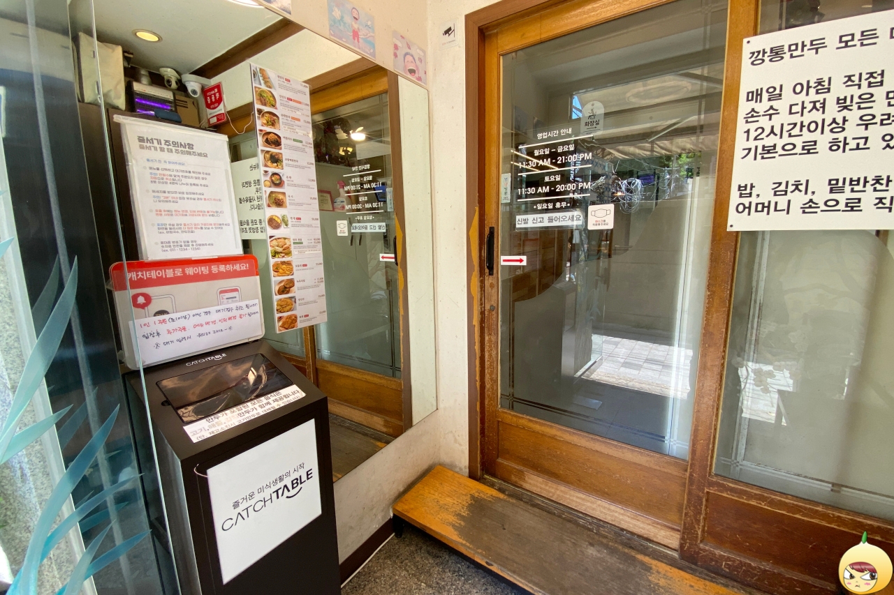 지난번에는 평일인데도 웨이팅이 있었다. 그런데 2시 언저리에 오니 아무도 없다. 이럴 때는 기계가 아닌 문을 열고 안으로 들어가 얼굴을 보면서 주문하면 된다. 브레이크타임은 3시 30분부터 5시까지이며, 점심 마지막 주문은 2시 40분이다. 혼밥은 늘 느즈막인데, 깡통만두도 늦게 와야 기다리지 않고 바로 들어갈 수 있나 보다.