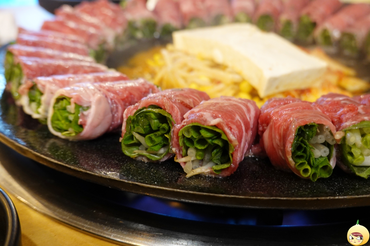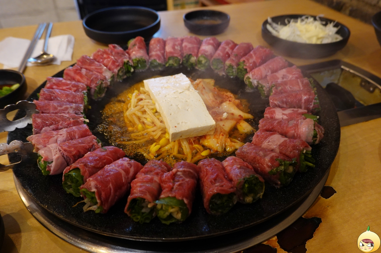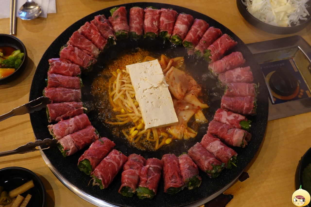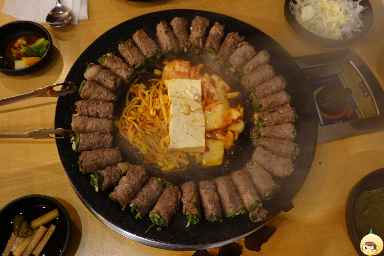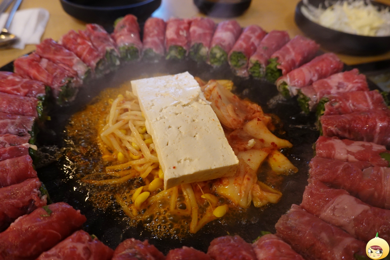 고기를 가지런히 올린 후, 가운데 빈 곳에 콩나물과 배추김치 그리고 두부를 올린다. 여기까지 한 후, 나머지는 알아서 해야 하는 줄 알았는데, 고기가 익을 때까지 직원이 다 해준다. 아마도 뒤집다가 고기말이가 풀릴 수 있어 그런 듯싶다.