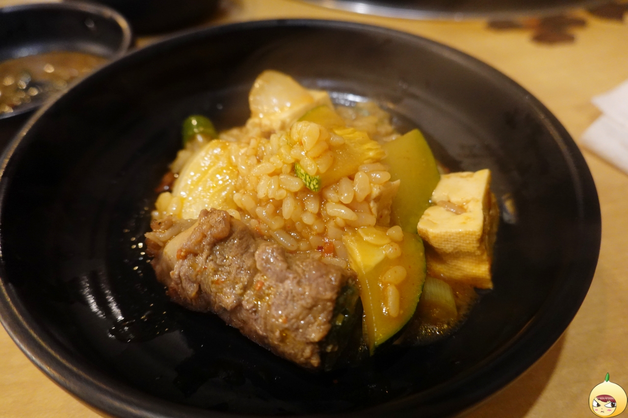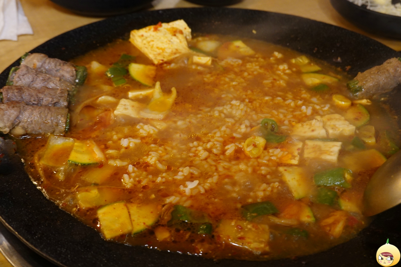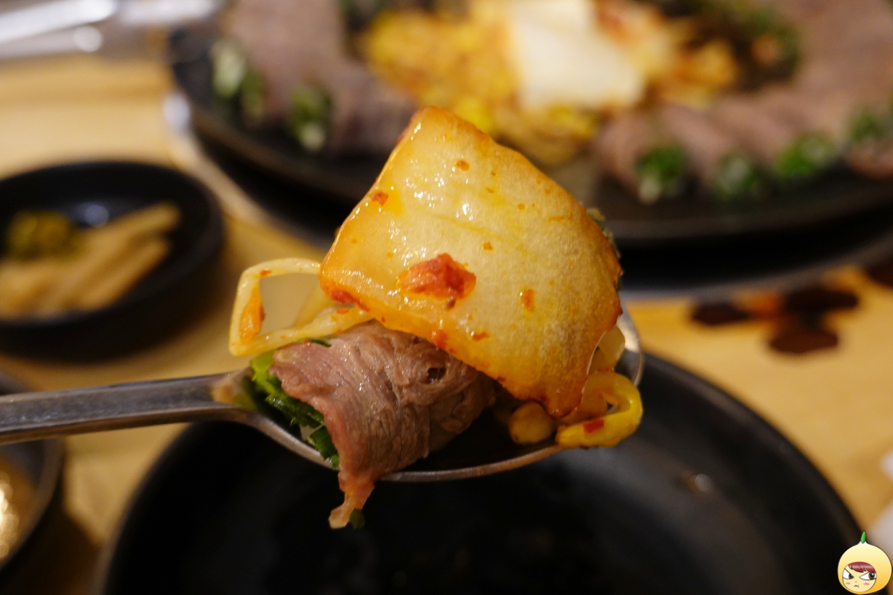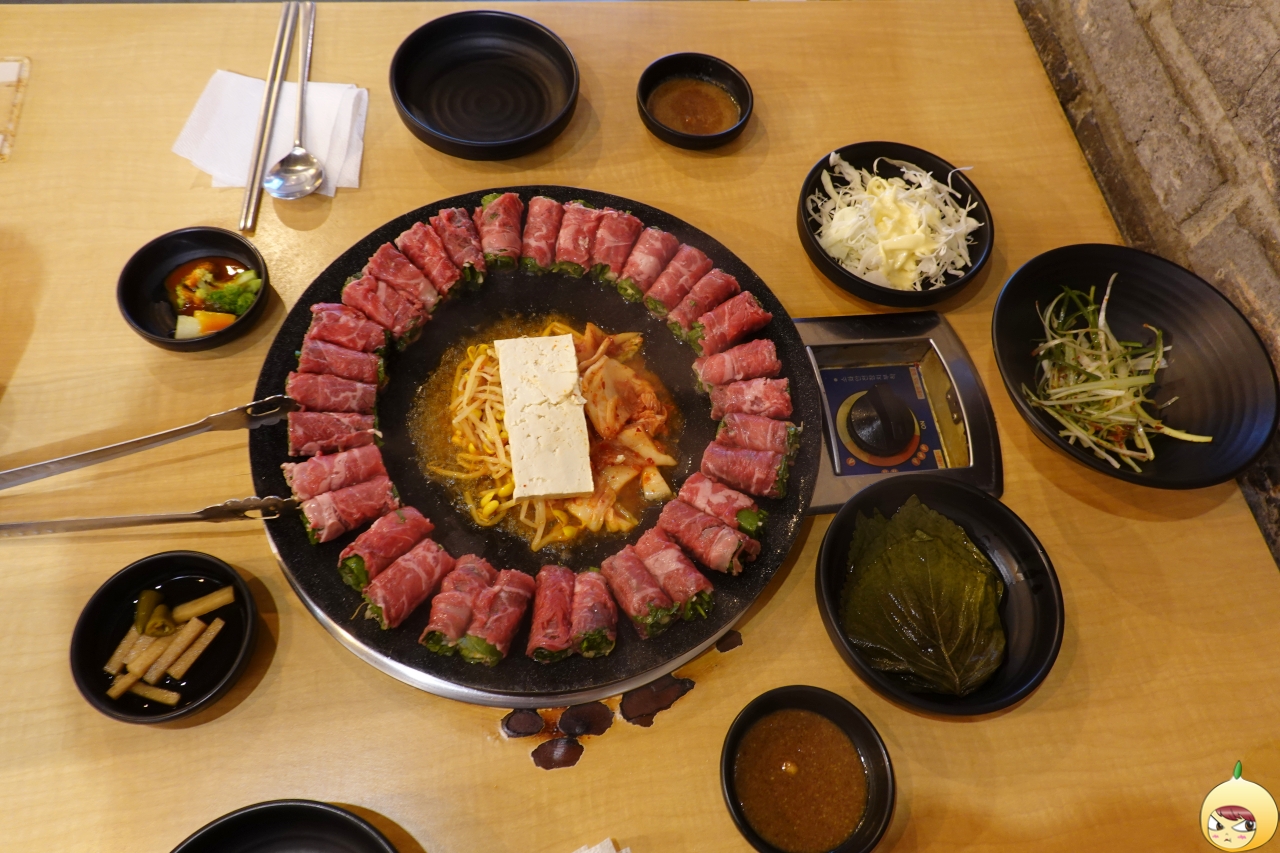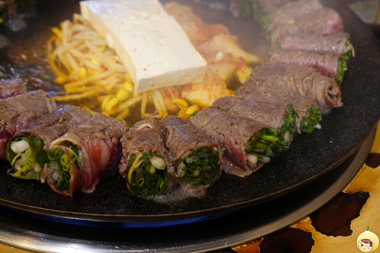 고기를 가지런히 올린 후, 가운데 빈 곳에 콩나물과 배추김치 그리고 두부를 올린다. 여기까지 한 후, 나머지는 알아서 해야 하는 줄 알았는데, 고기가 익을 때까지 직원이 다 해준다. 아마도 뒤집다가 고기말이가 풀릴 수 있어 그런 듯싶다.