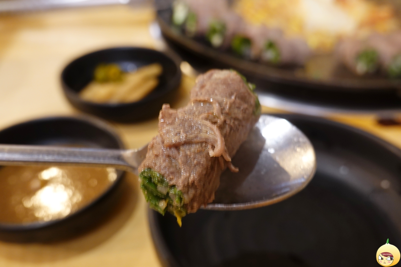 직원이 음식을 들고 와, 가장 먼저 솥뚜껑 같은 저기에 기름을 가득 붓는다. 그리고 고기말이를 올리는데 가운데에 모인 기름 안에 고기를 담근 후, 가장자리로 세팅을 한다. 고기는 기름이 별로 없는 부위를 사용하다 보니, 아마도 따로 기름을 추가하는 듯하다.
