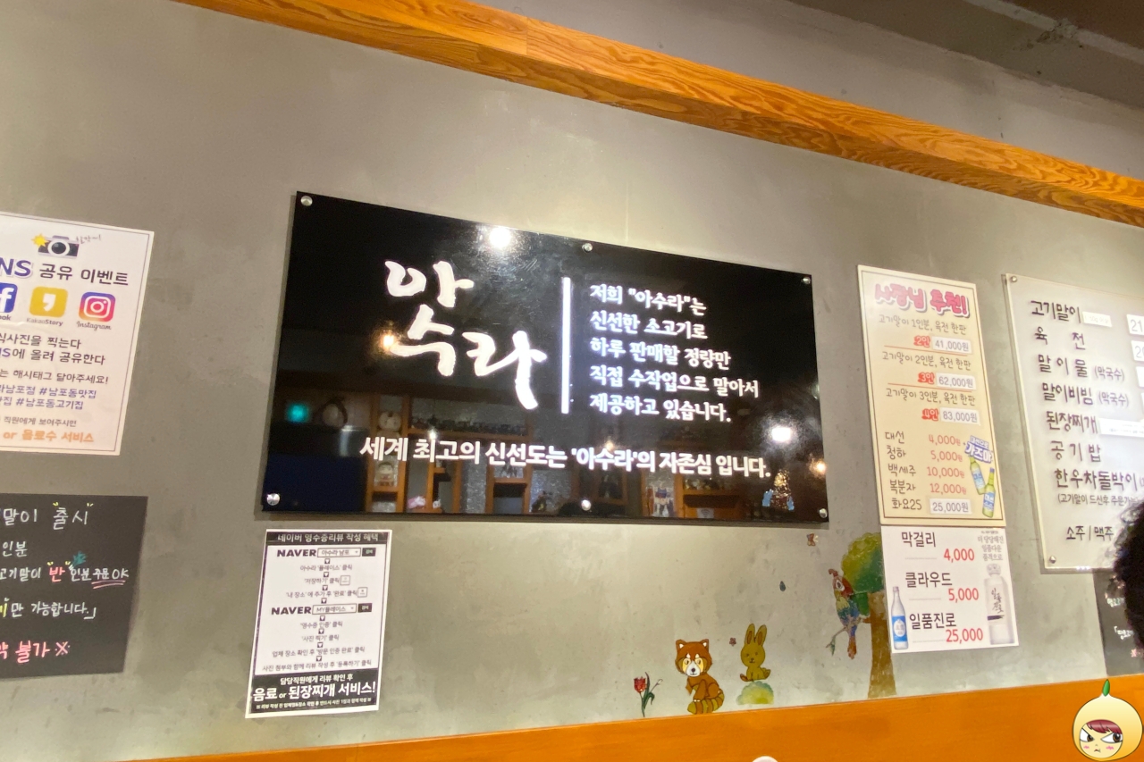 부산하면 떠오르는 음식들이 있다. 돼지국밥은 비계 때문에, 밀면은 맘에 드는 곳을 찾지 못해, 한 지붕 11집 양곱창은 내장이라서 먹지 못한다. 까다로운 입맛이라 친구는 꽤나 애를 먹었을 텐데, 불에 구운 고기가 먹고 싶다는 말에 부산시 중구 부평동에 있는 아수라에 가자고 한다.