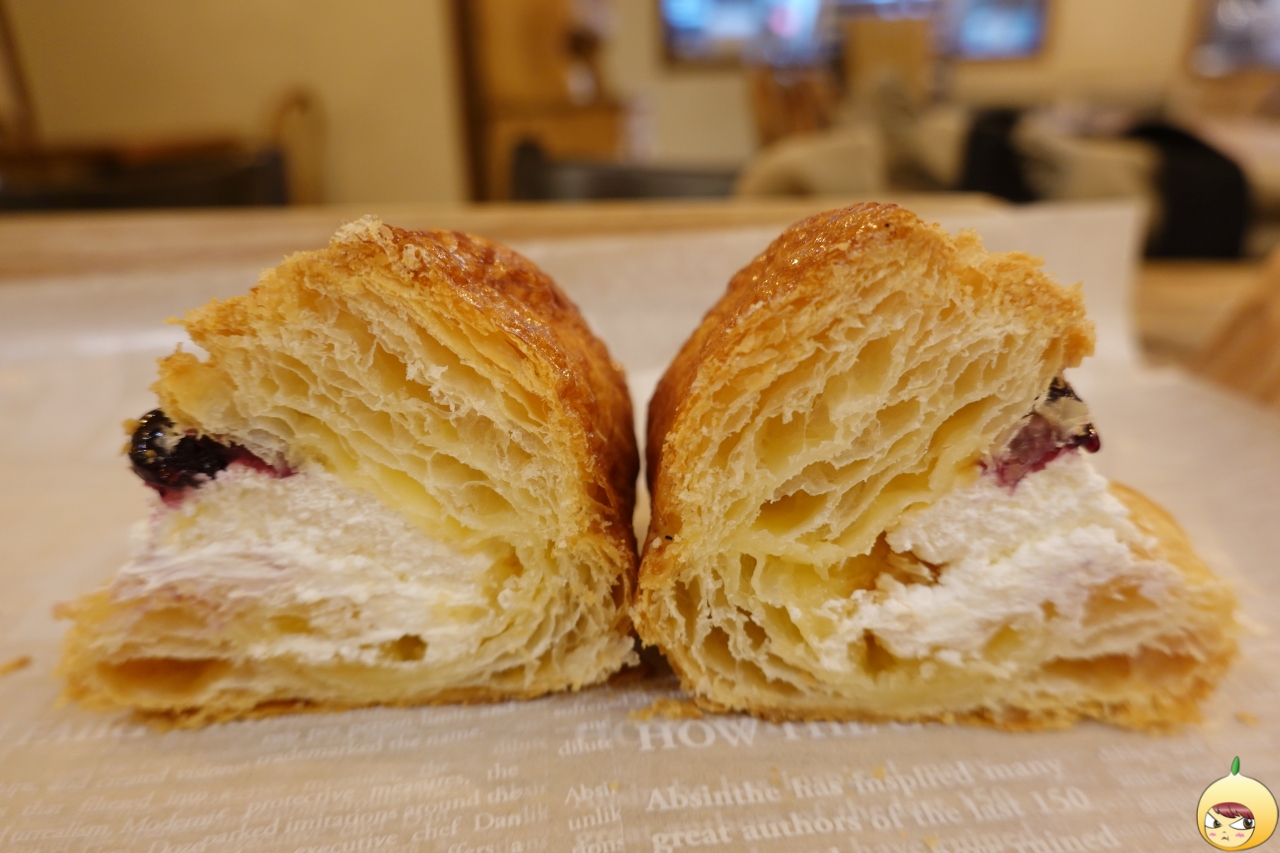 오리지널을 맛봤으니 무엇을 더한 녀석(?)들을 만날 차례다. 무엇을 먹을까 나름 고민에 고민을 거듭해서 고른, 블루베리 요거트파이(3,600원)다. 모양은 같은데 다른 점은 조린 사과는 없고 샌드위치에 소스를 바르듯, 아래에 사과잼을 발랐고 센터는 블루베리잼(?)과 요거트 크림이 차지했다.