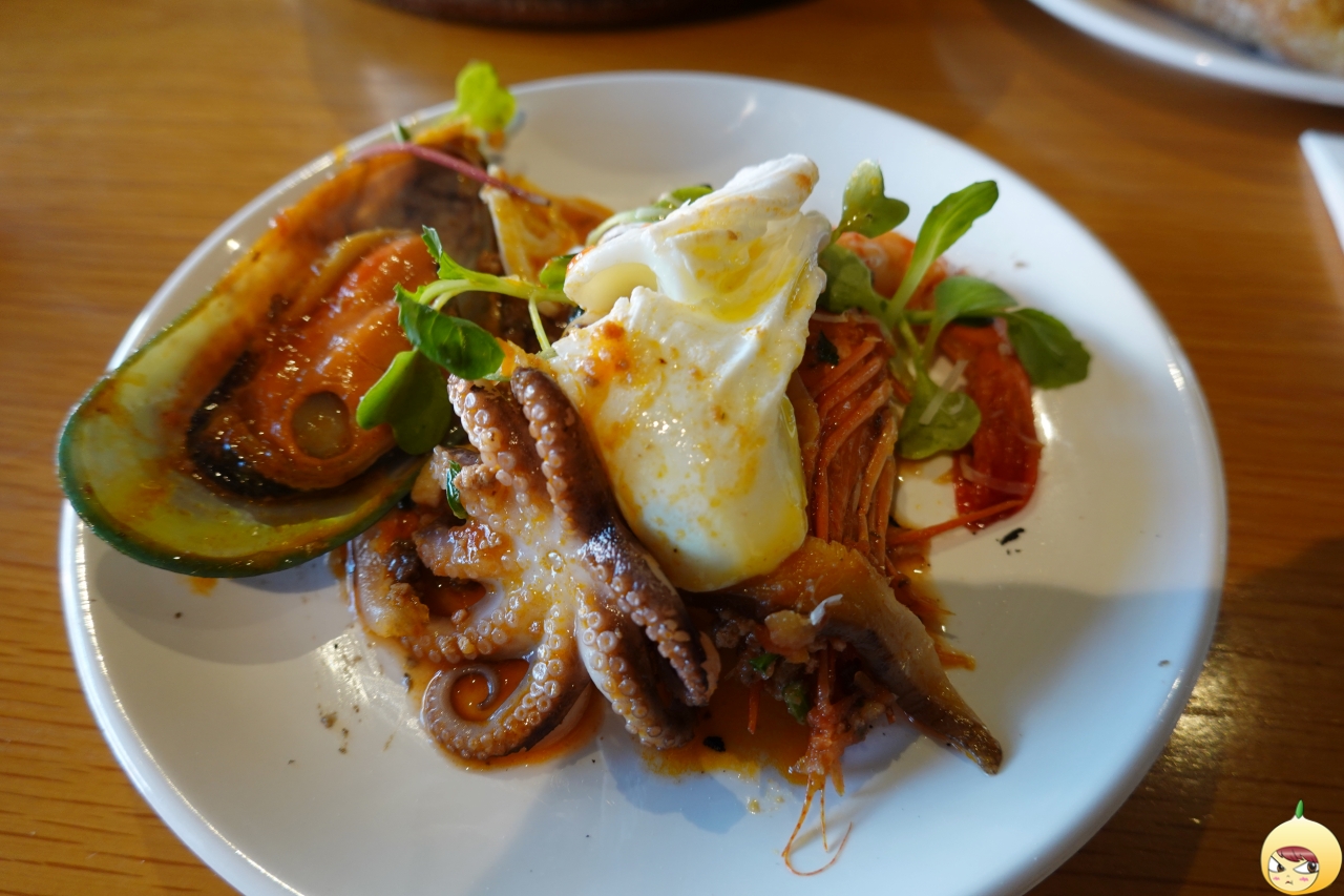 처음에는 간편하게 세트메뉴를 먹을까 하다가, 시그니처를 꼭 먹어야 하기에 단품으로 주문을 했다. 우선 샐러드는 시그니처 문어샐러드를, 화덕피자는 놓칠 수 없기에 풍기피자를, 마지막은 부산에 오면 해산물은 선택이 아니라 필수이기에 라구까수엘라를 주문했다.