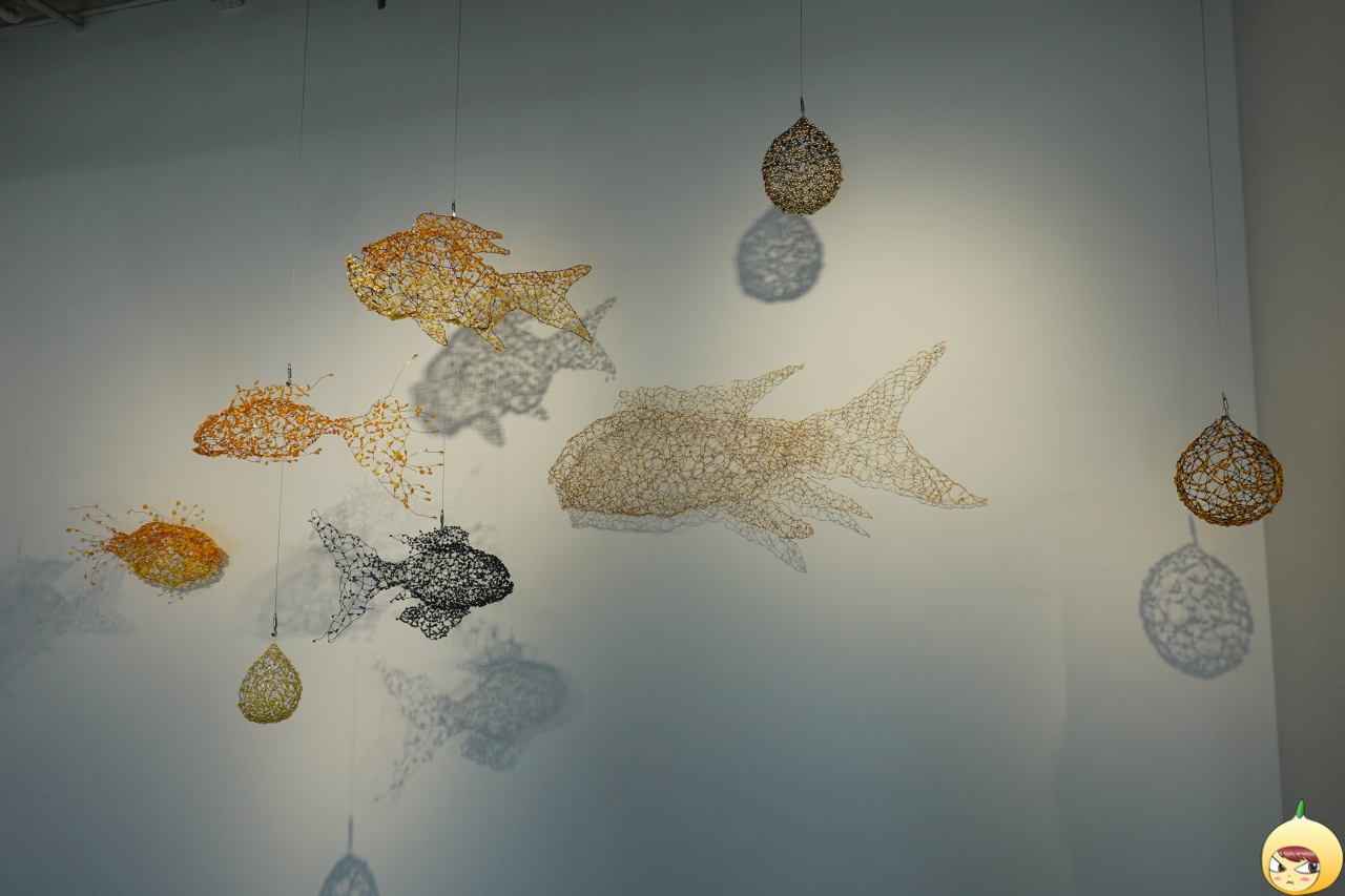 1층은 금기숙 작가의 최근 대표작인 물방울과 물고기가 설치됐다. 물방울로 가득 찬 좁고 긴 공간 속을 헤엄치는 물고기 작품은, 패션아트에서 출발한 작업이 이제 독립적인 조형 언어로서 새로운 지평을 열고 있음을 보여준다고 안내문에 나와 있다.