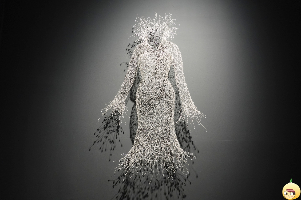 작가는 철사, 노방, 구슬, 스팽글, 호박, 산호, 단추 등 이질적이고 비전통적인 재료들을 결합해 선과 빛이 끊임없이 변주하는 독창적인 작품 세계를 구축했다. 단단하면서도 유연한 선은 드레스, 재킷, 코트, 베스트와 같은 구조를 이루고, 그 위에 촘촘하거나 느슨하게 꿰어달린 구슬과 스팽글은 조명의 강도와 각도에 따라 끊임없이 달라지는 빛과 그림자를 만들어낸다.