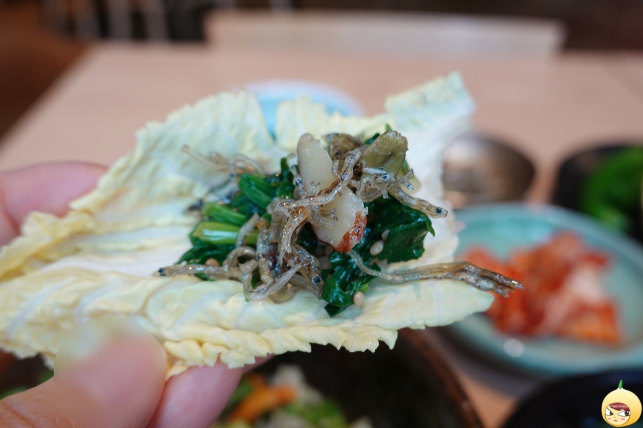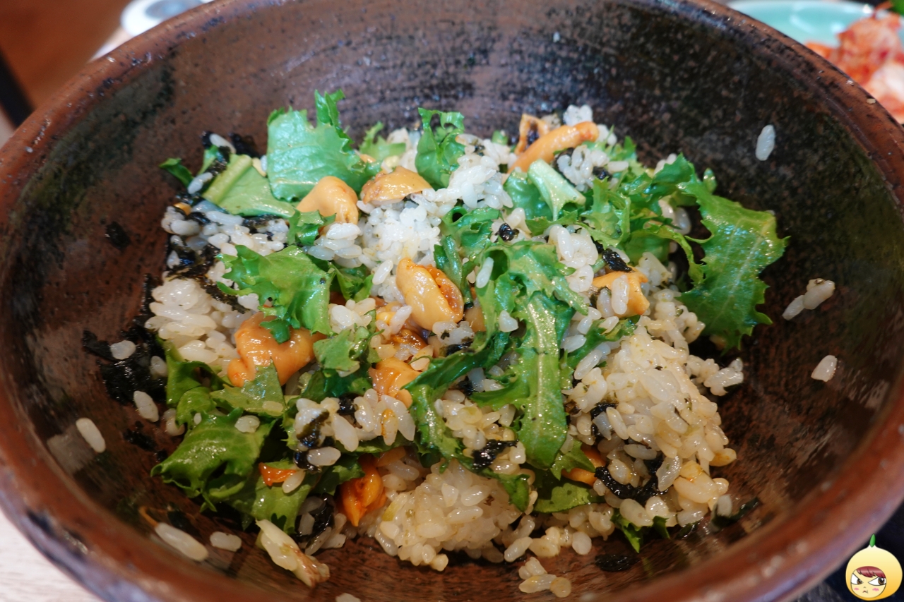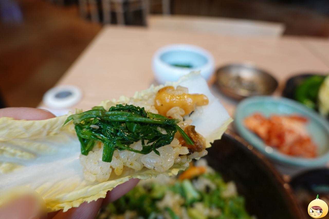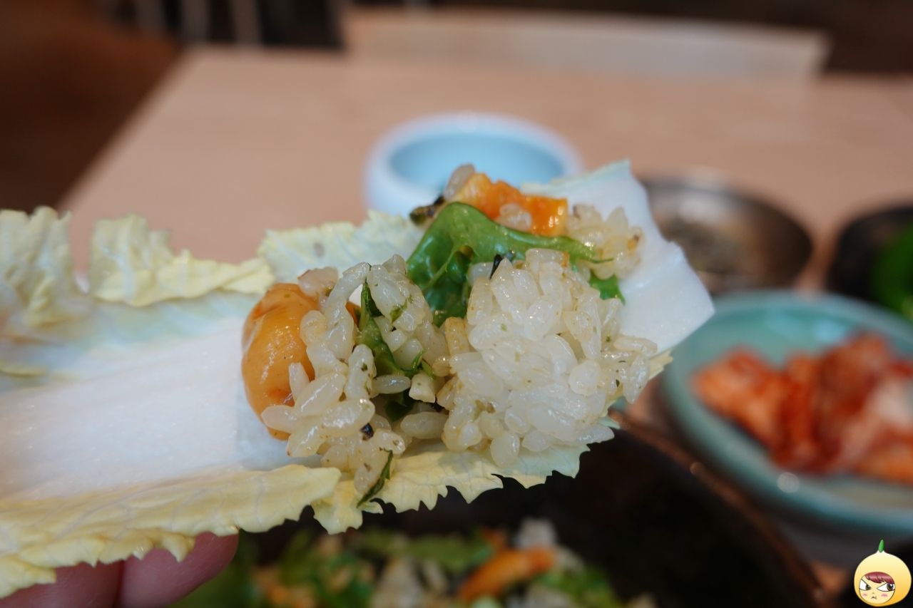 멍게만 먹어도 좋은데, 여기에 밥과 김가루, 치커리가 더해져 훨씬 고급진 맛이 난다. 집에서 충분히 따라 할 수 있지만, 늘 여기에 와서 먹는다. 이유는 멍게 손질하기 귀찮고, 때깔이 쥑이는 된장찌개가 없기 때문이다. 알배추가 있으니 오픈쌈으로도 먹어본다. 락희옥은 가격대가 있지만, 쌈채소만 봐도 알 수 있다. 재료 하나하나 진심이라는 것을...