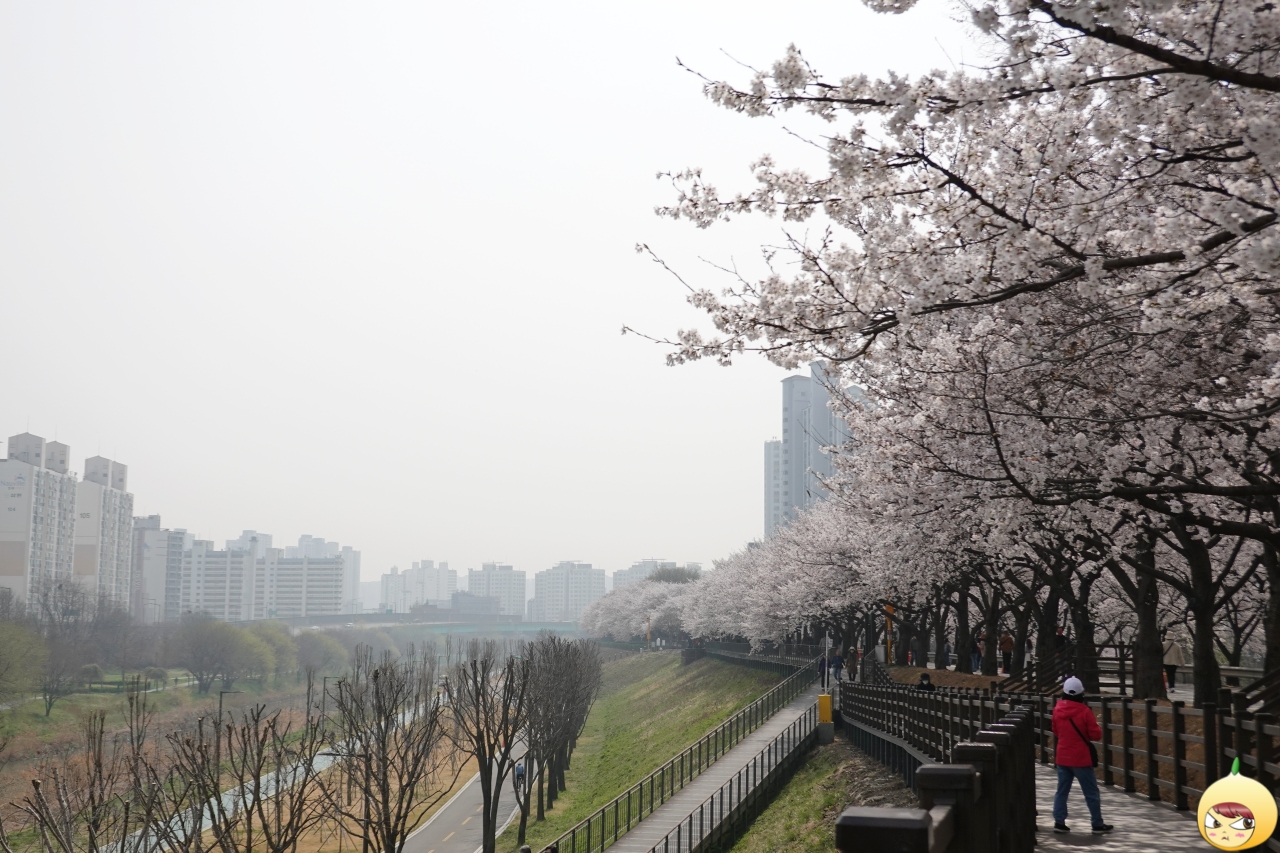 왼쪽에 보이는 건물은 도림천역이다. 벚꽃터널은 둑방길이 끝나는 지점에서 도림천역으로 이어지는 도로에 있다. 신정교로 진입하는 작은 도로이다 보니, 차도 사람도 없는 한적한 도로다. 그런데 흐드러지게 벚꽃이 피면, 사람들로 인산인해를 이루는 북적북적한 도로로 변한다. 여의도나 석촌호수에 비할 수는 없지만, 확실히 몇 년 전보다 찾는 이가 많아졌다.